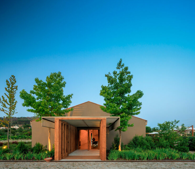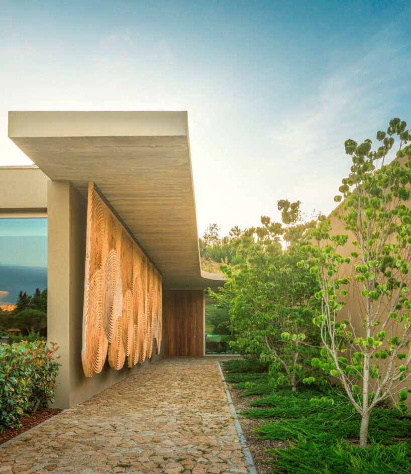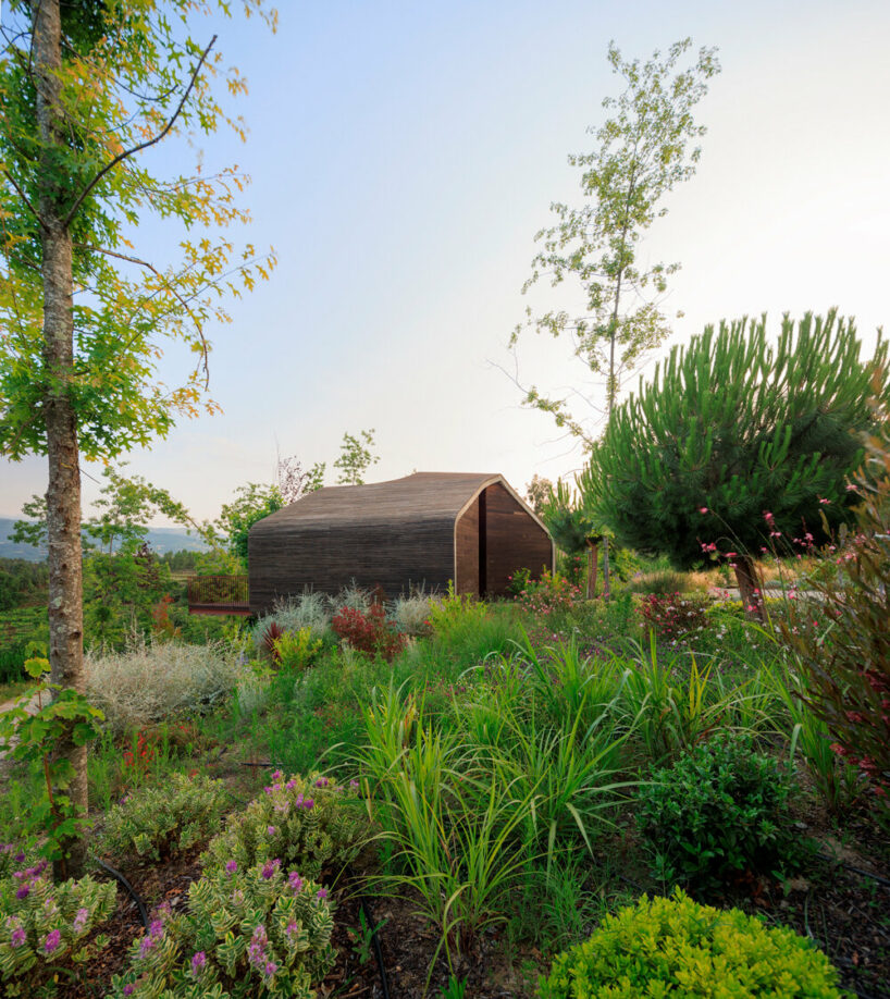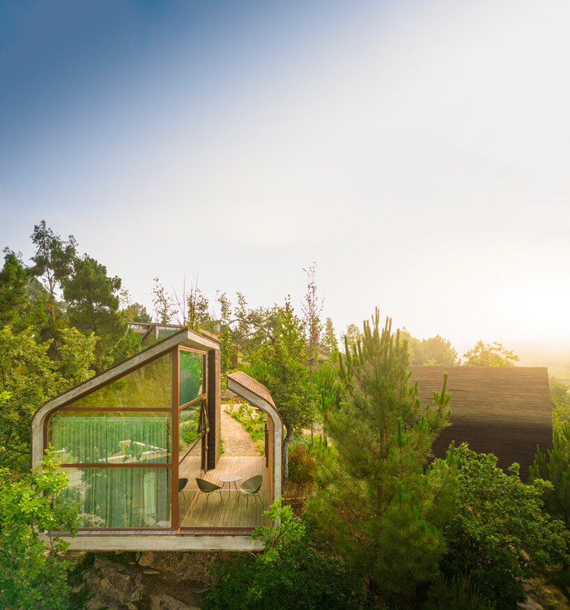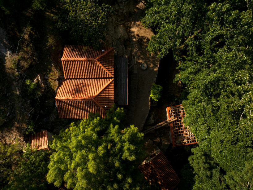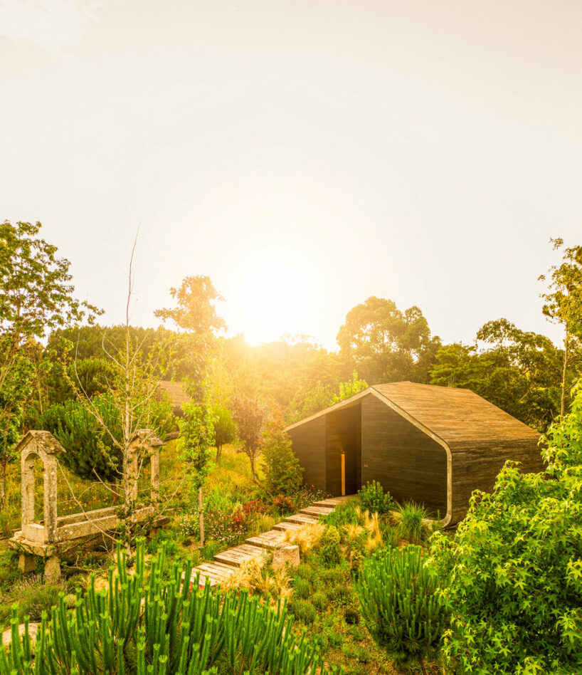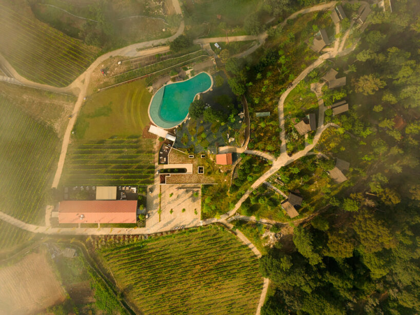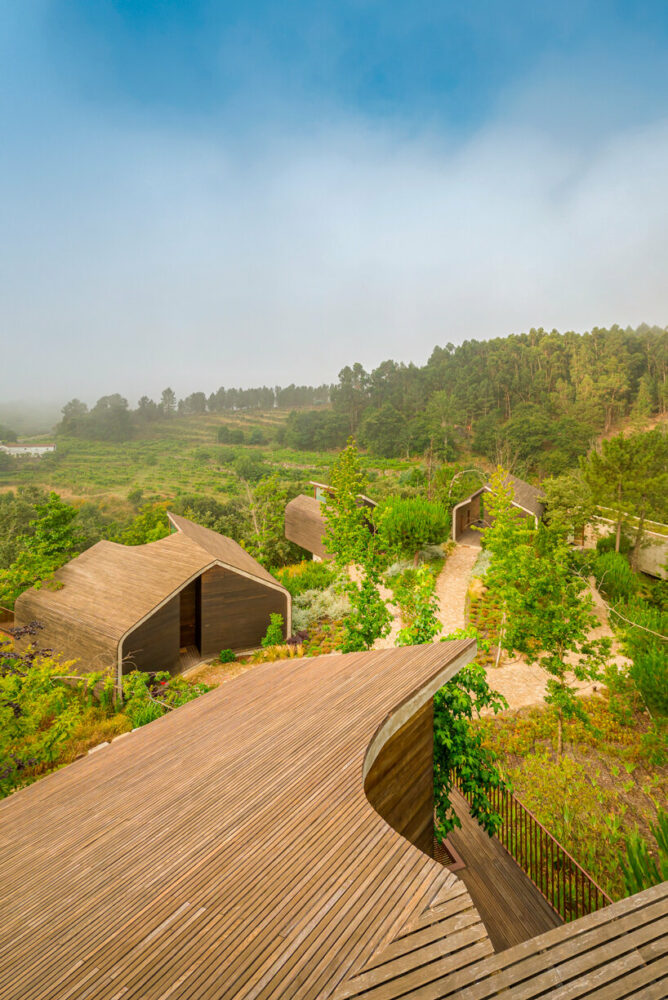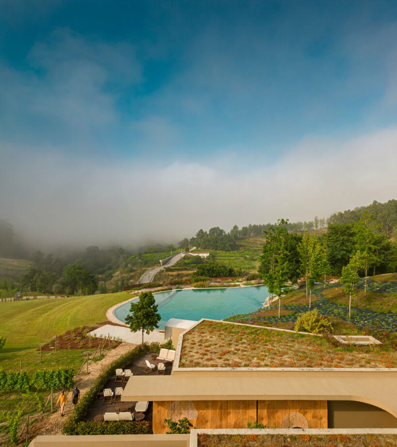 the project sits like a ring placed over the terrain, with its funnel-like roof forming a shaded perimeter walkway and an introverted core.