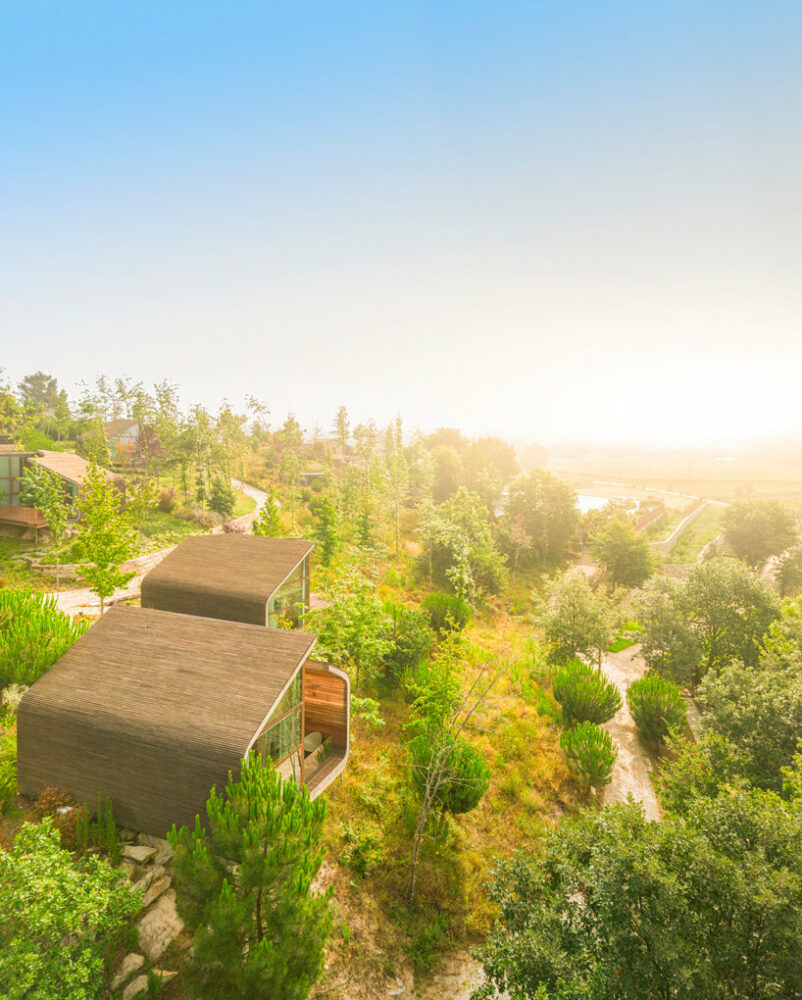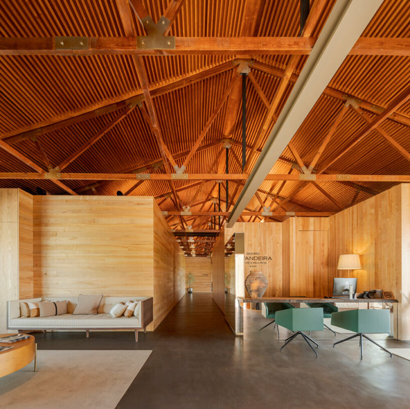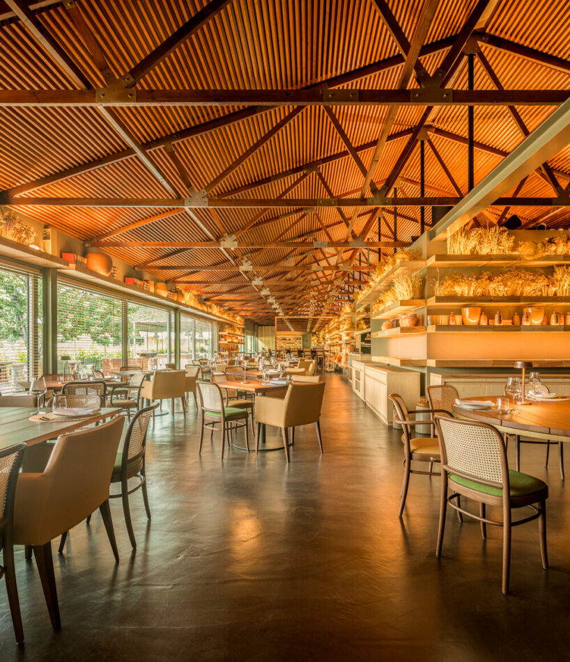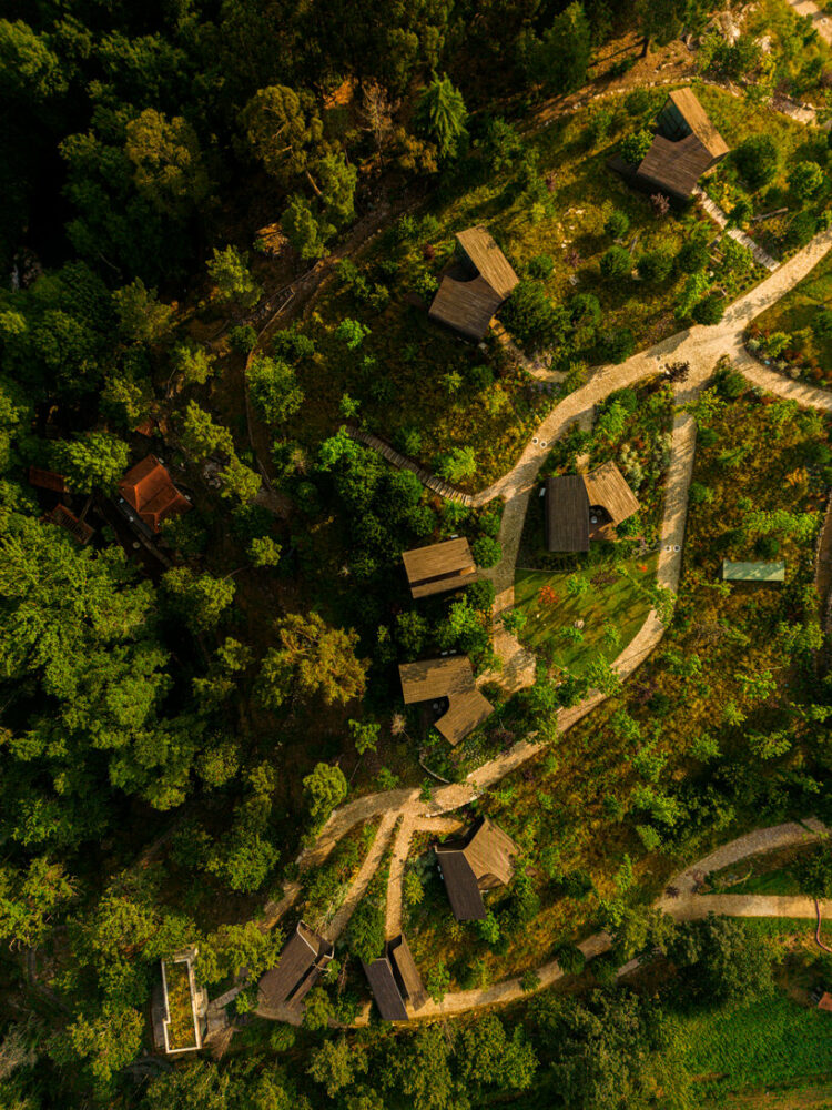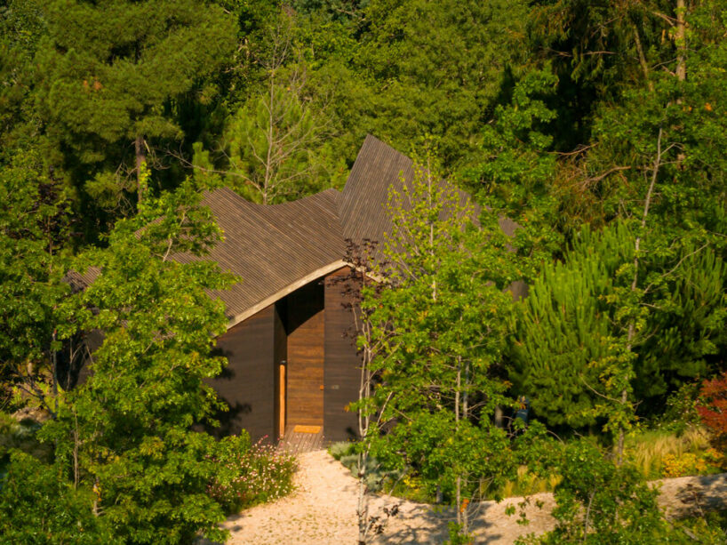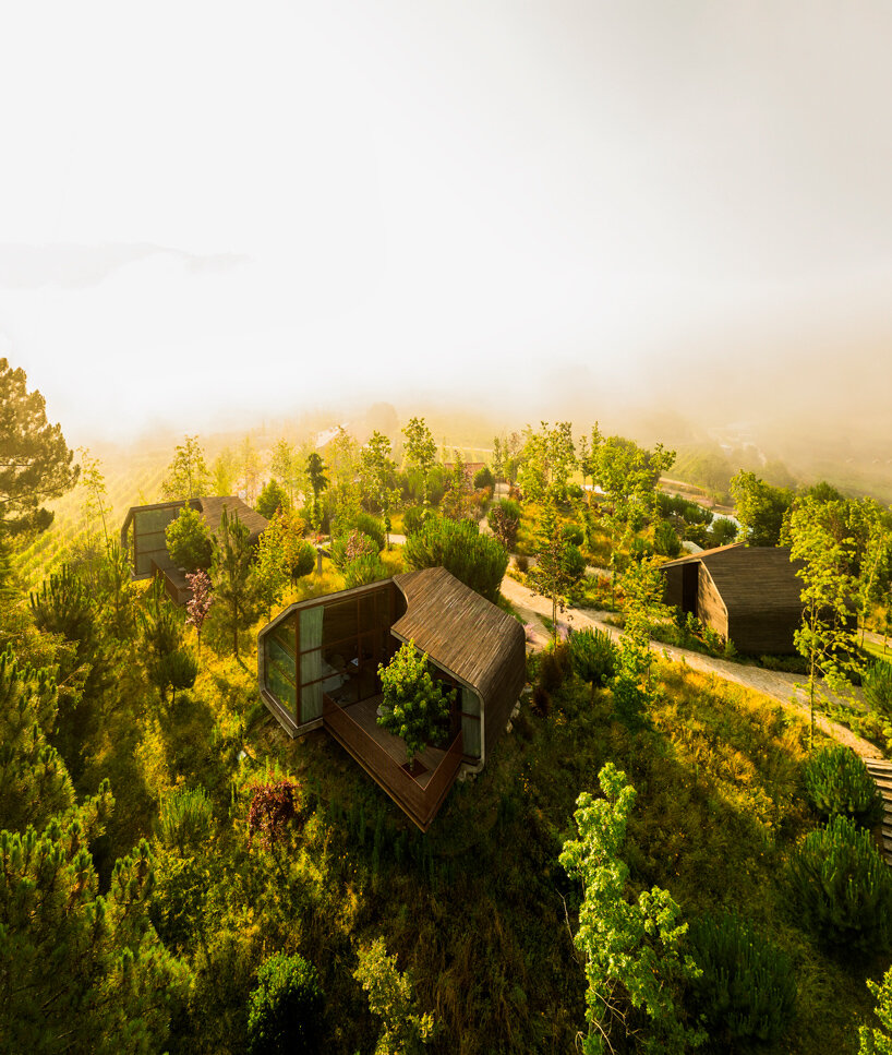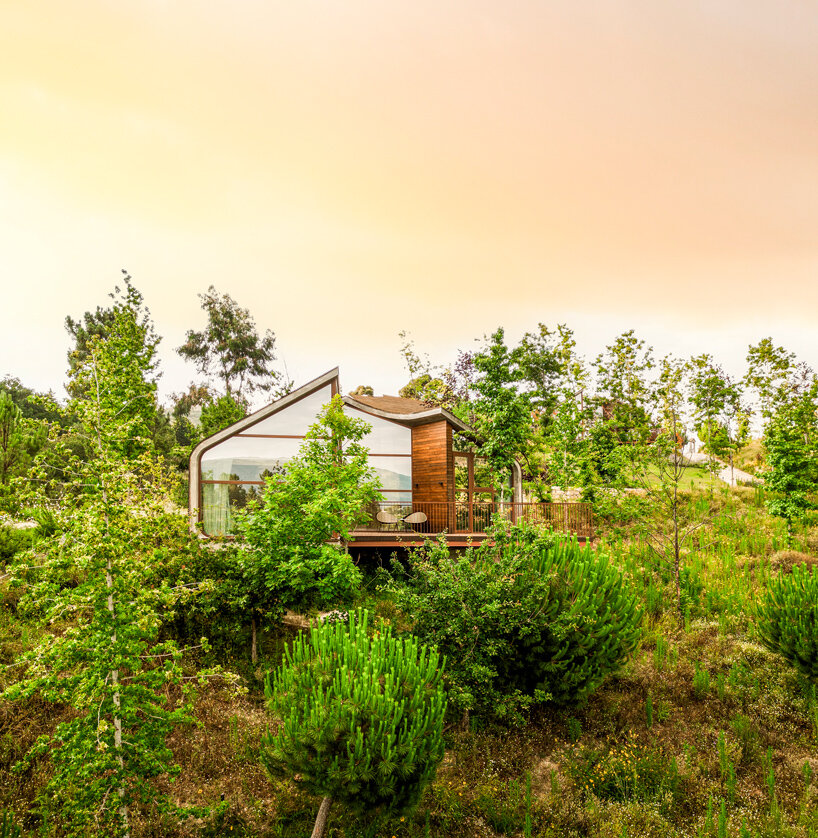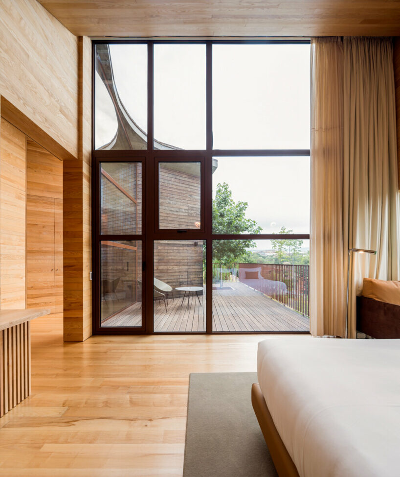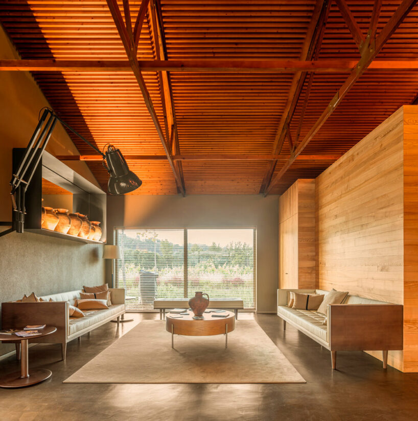 the project sits like a ring placed over the terrain, with its funnel-like roof forming a shaded perimeter walkway and an introverted core.