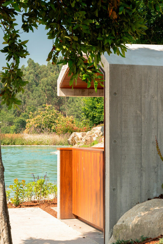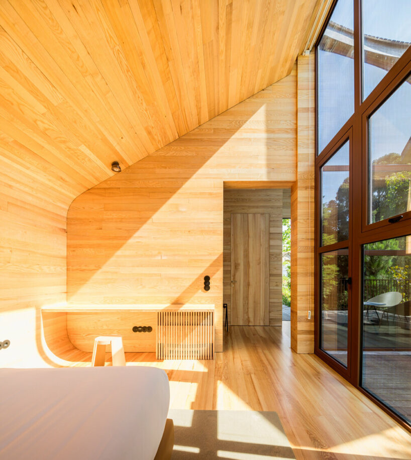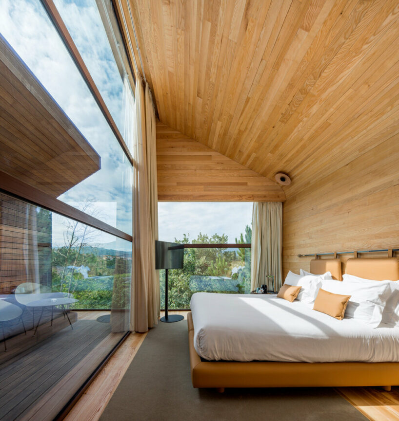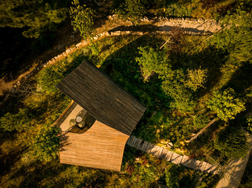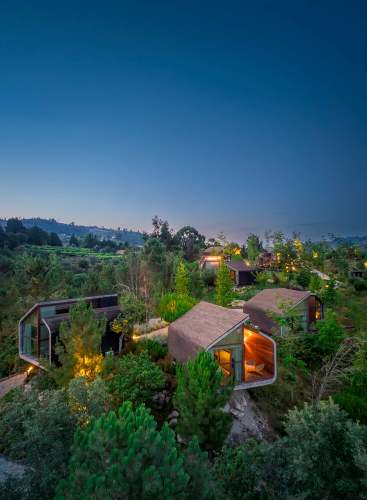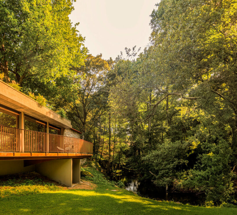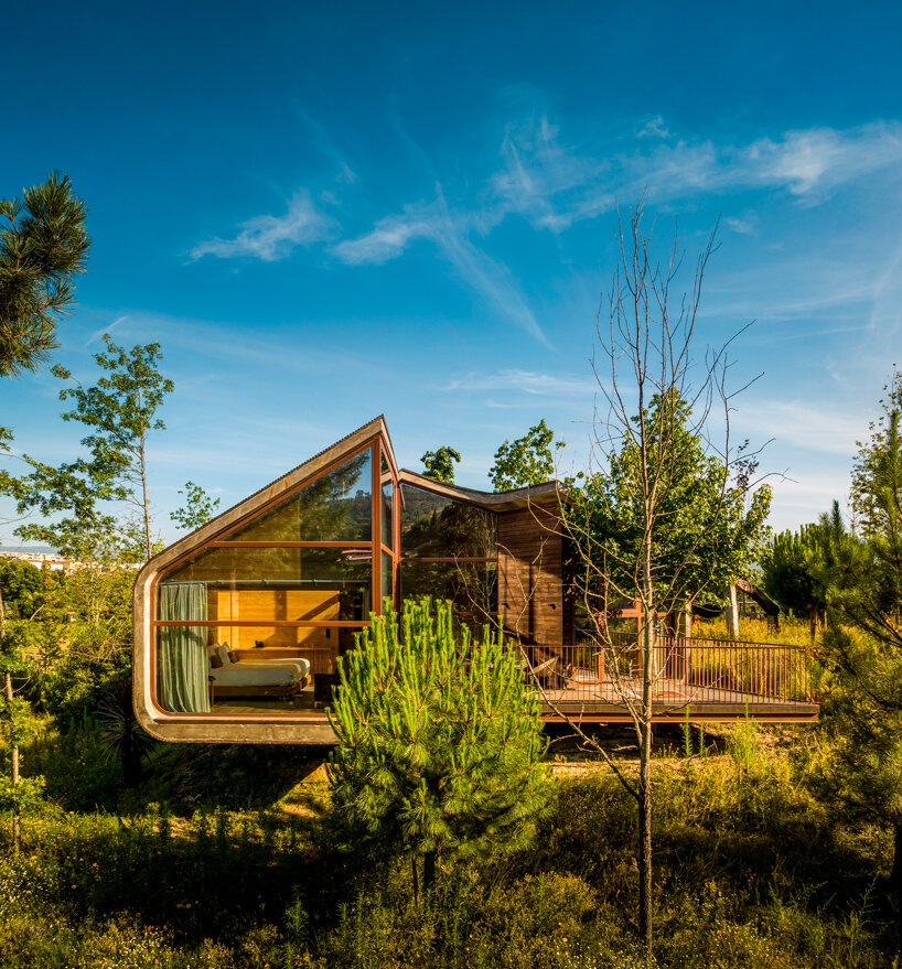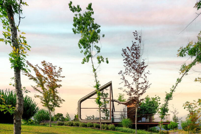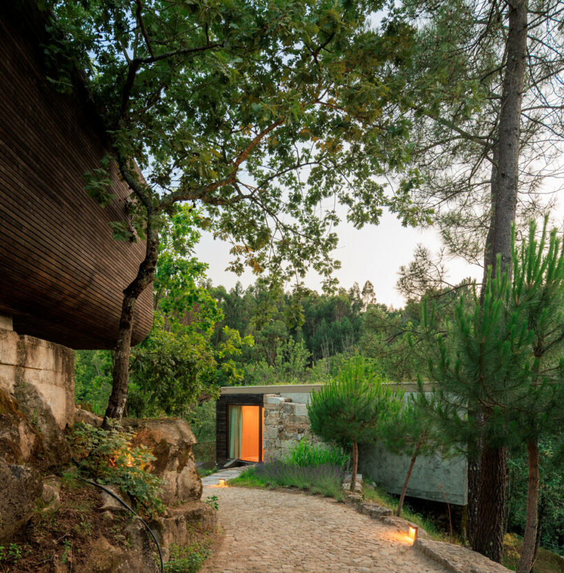 the project sits like a ring placed over the terrain, with its funnel-like roof forming a shaded perimeter walkway and an introverted core.