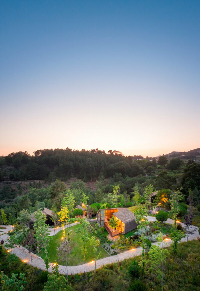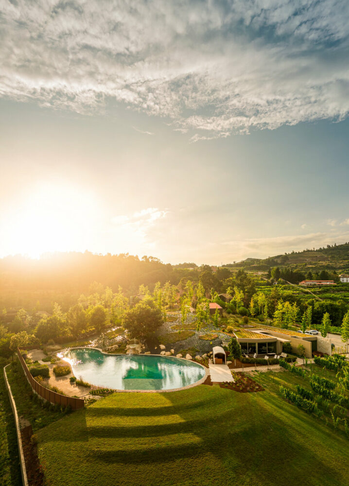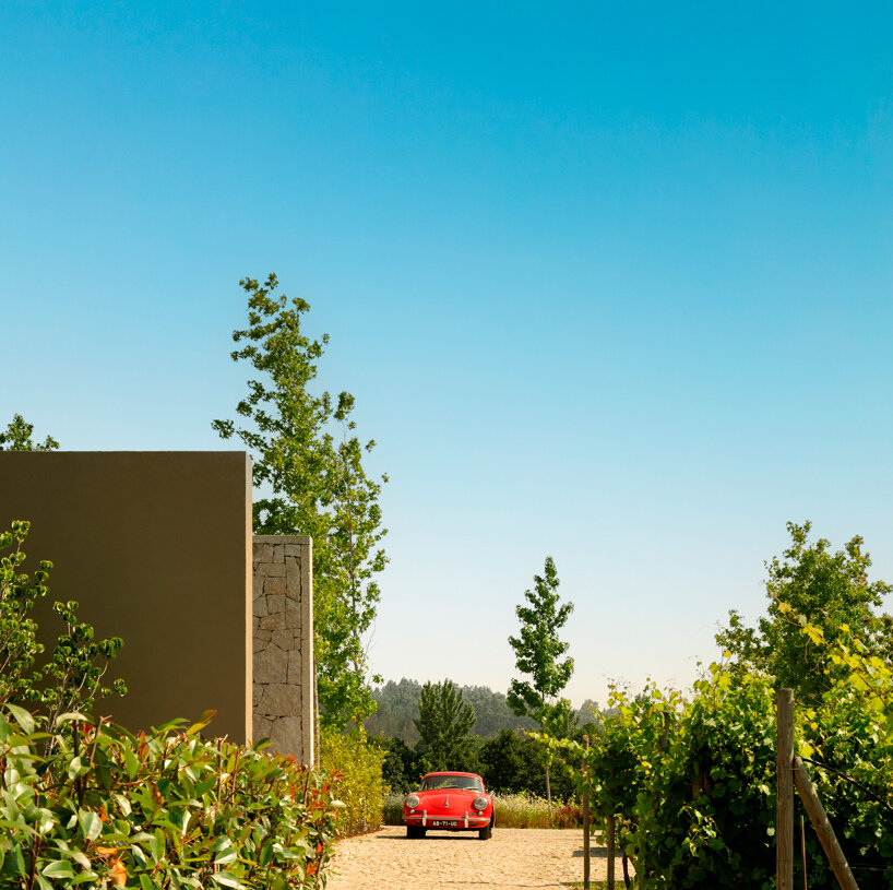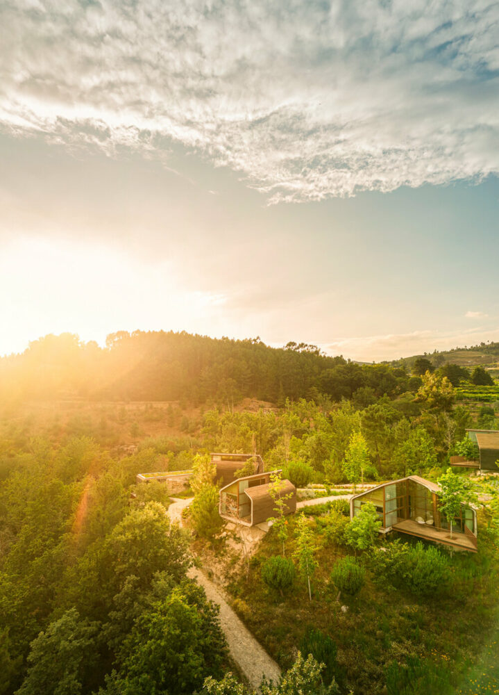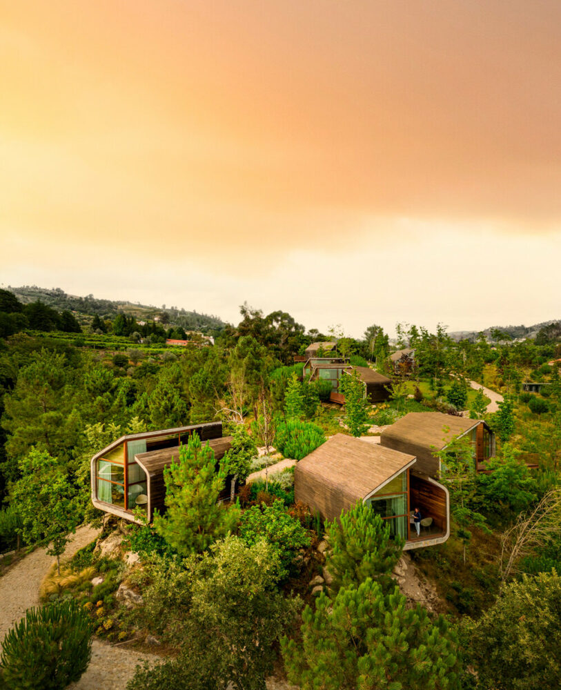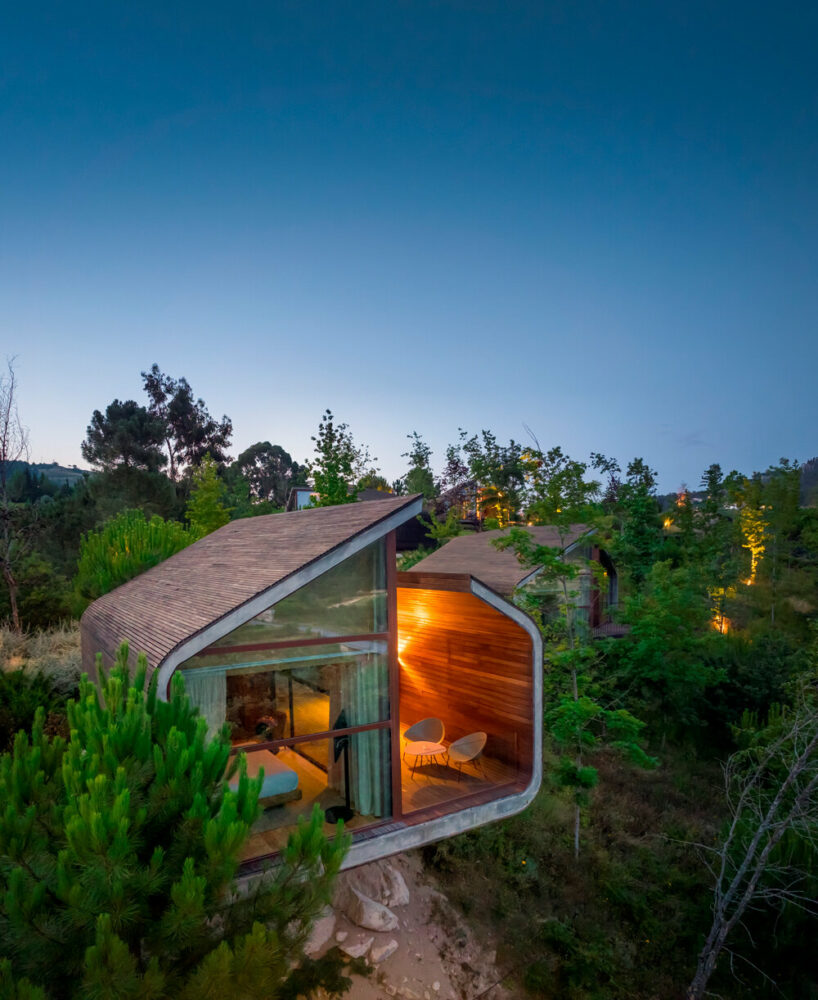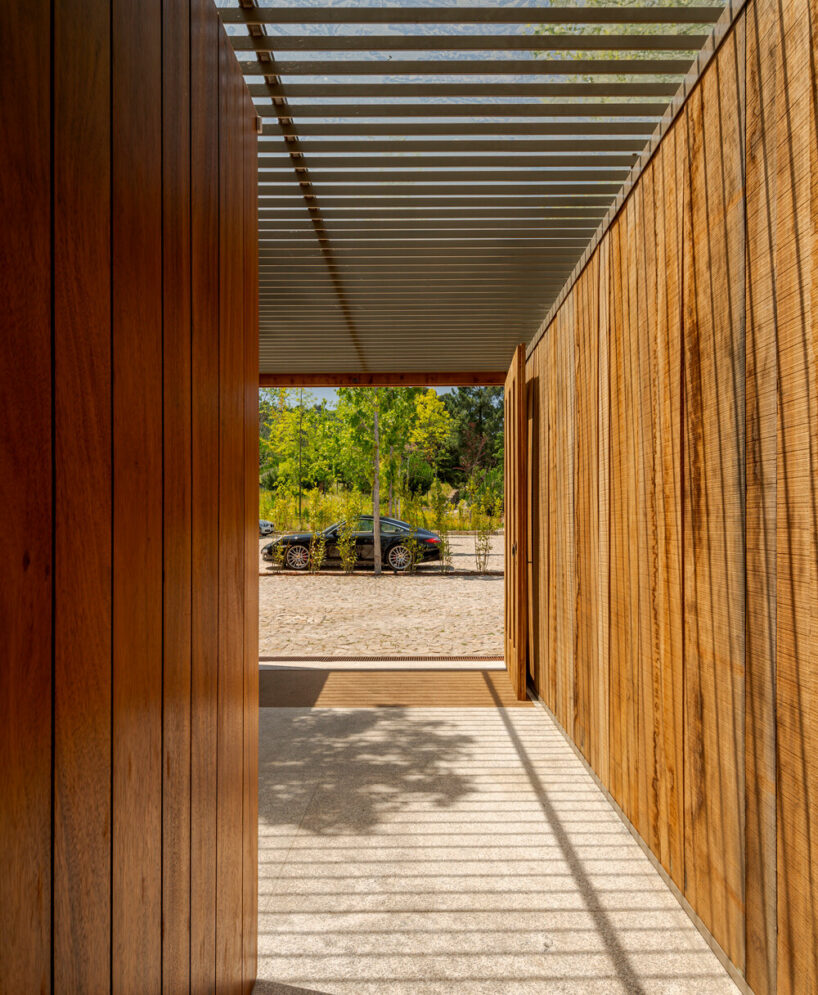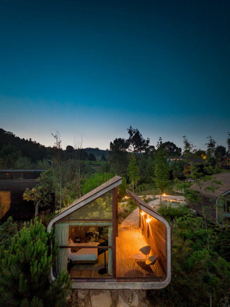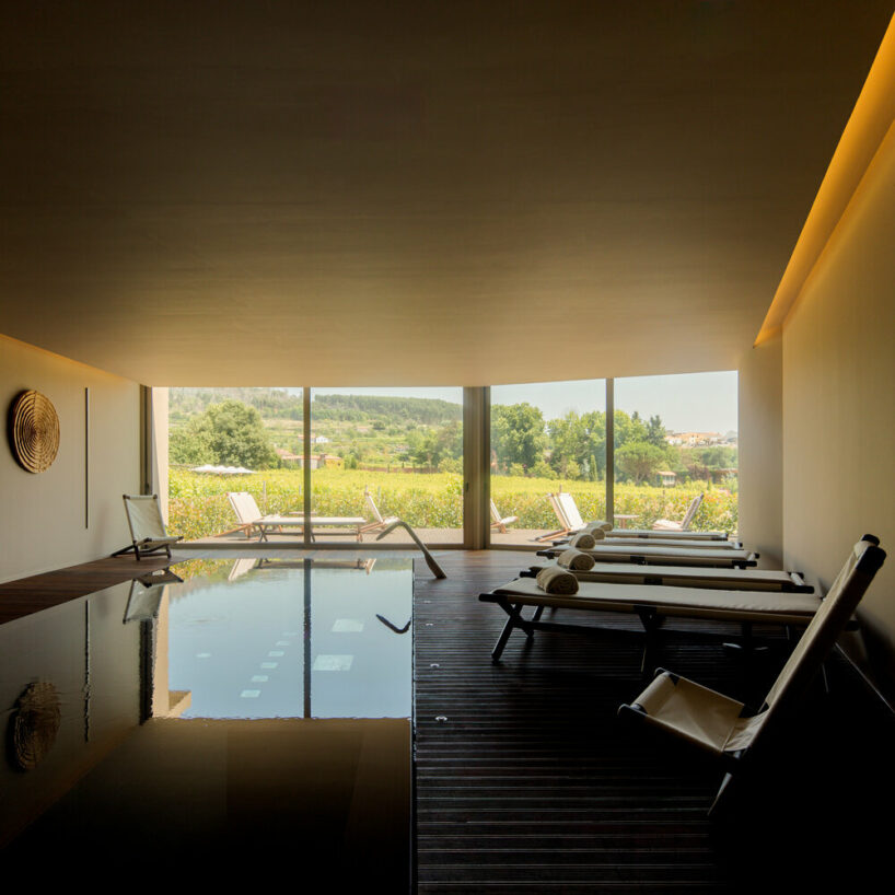 the project sits like a ring placed over the terrain, with its funnel-like roof forming a shaded perimeter walkway and an introverted core.