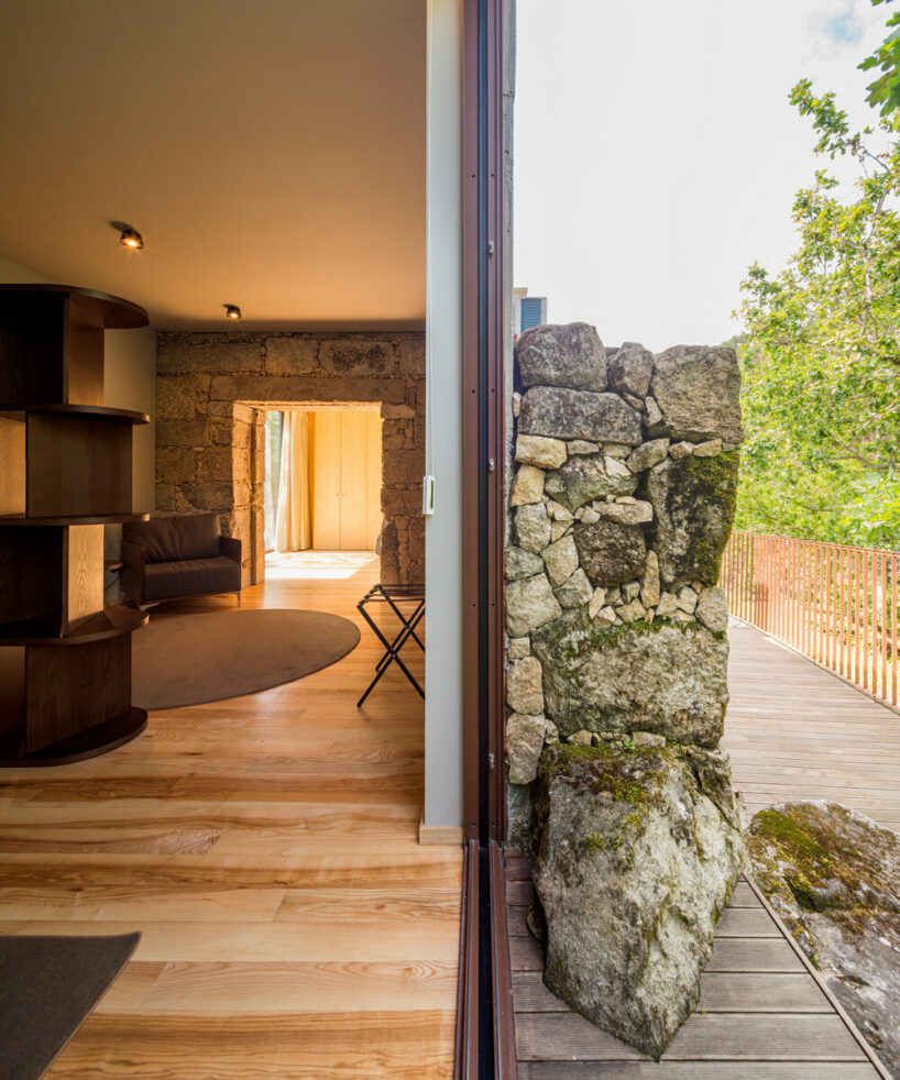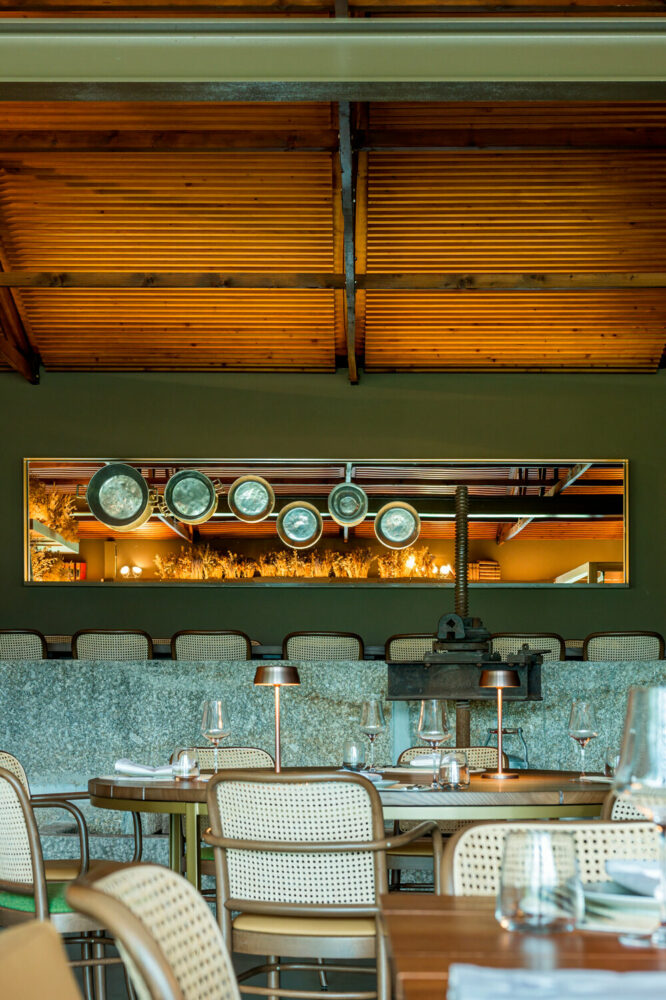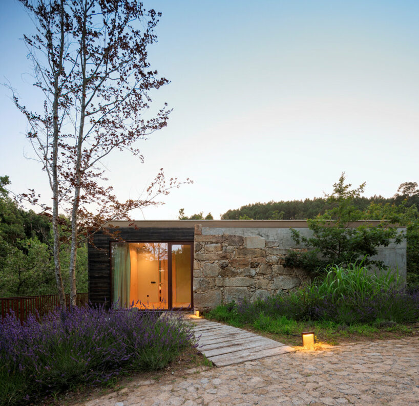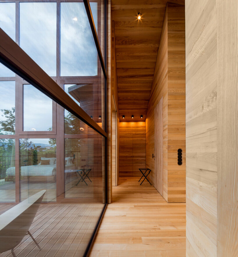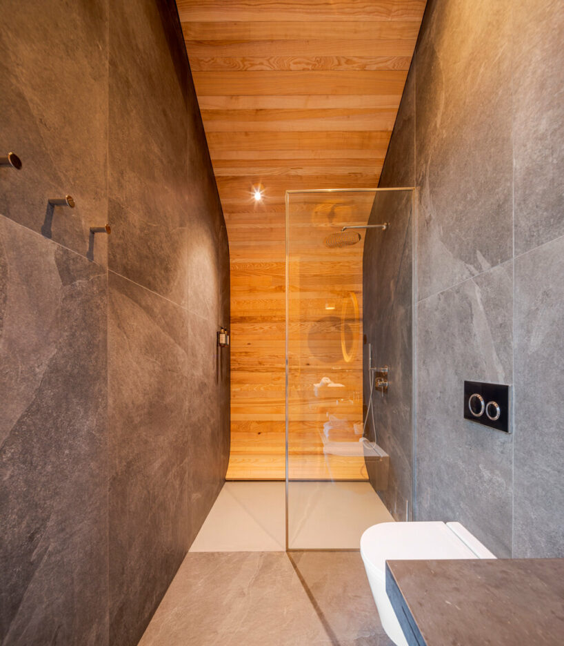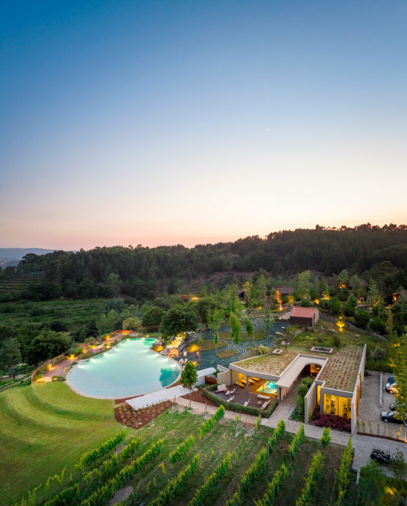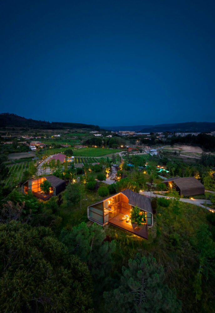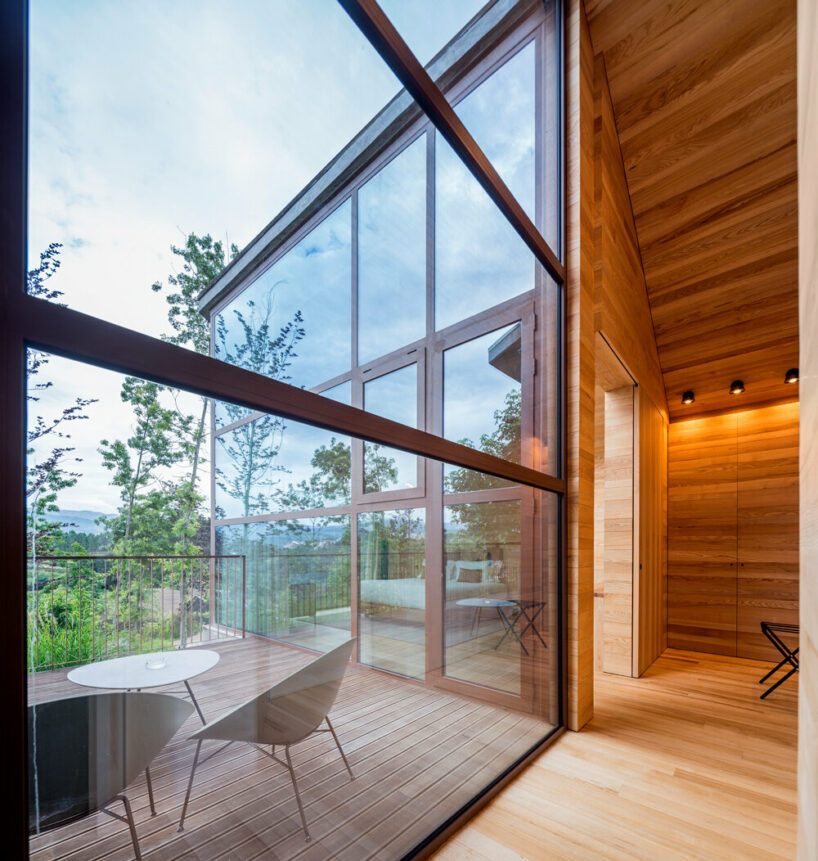 the project sits like a ring placed over the terrain, with its funnel-like roof forming a shaded perimeter walkway and an introverted core.