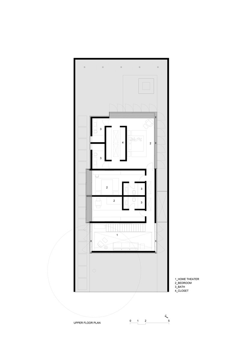 With regard to the program, the ground floor hosts the public functions including an open plan kitchen, living and dining area. This space extends outside to an outdoor dining table on the terrace as well as a small pool, fire pit, and seating area in the garden. The upper floor contains three bedrooms and a home theater while the basement level comprises an additional bedroom as well as a laundry room and other services.