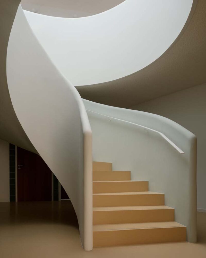 to avoid the overly functional and often bleak design found in healthcare facilities, the architects modeled the interiors with a warm and homely palette of colors and materials. once inside, a spiral staircase welcomes visitors on the ground floor and forms the heart of the building. communal areas and three other studios, meanwhile, complete the lower level with extra attention given to accessibility.