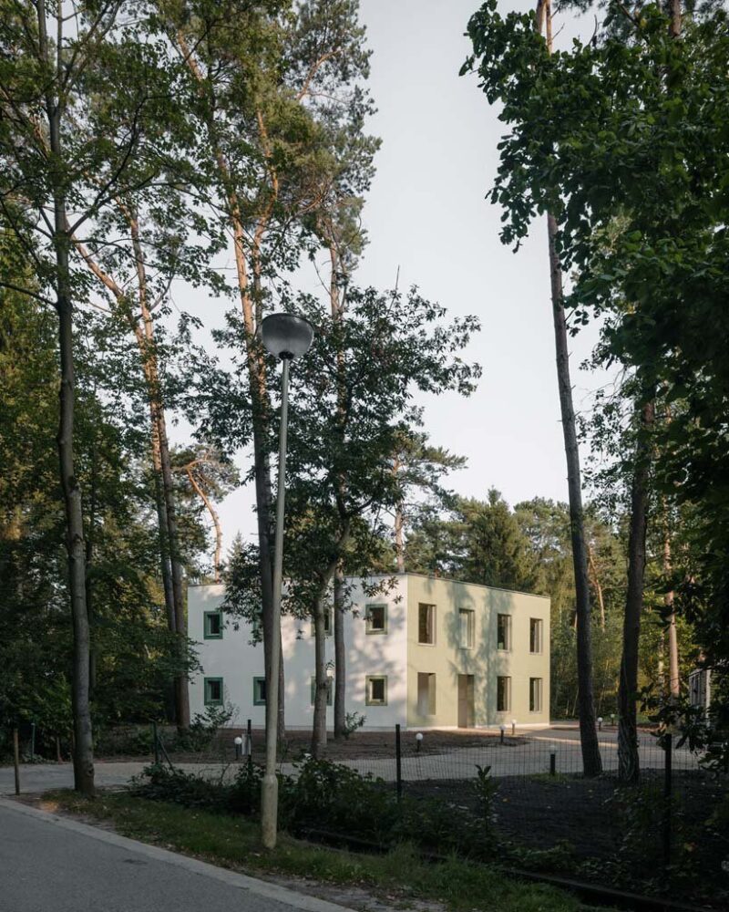 completed by FELT architecture & design, villa kameleon is a care home sitting in a forested site of zoersel, belgium. in partnership with a non-profit organization (NPO), the project is designed for a private client who wished to accommodate their granddaughter and eight other residents suffering from mental disability. the architects carefully positioned the care home within the forest in such a way as to maximally preserve the green charm of the site and inject natural lighting into the space.