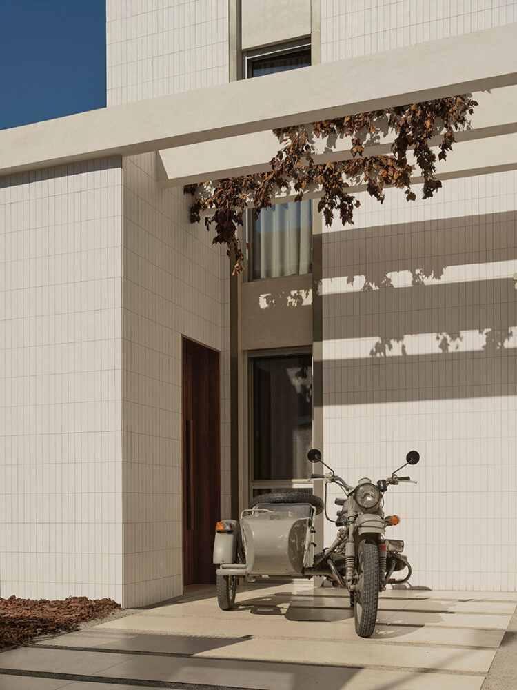 at the heart of the house lies an interior courtyard, clad in vertically arranged porcelain tiles
