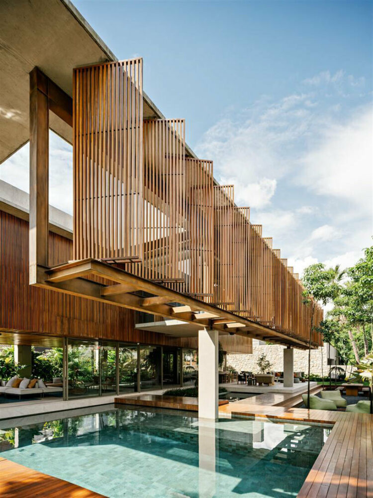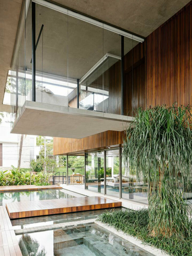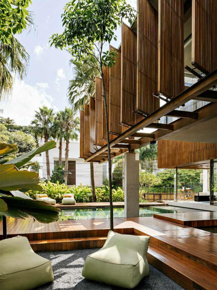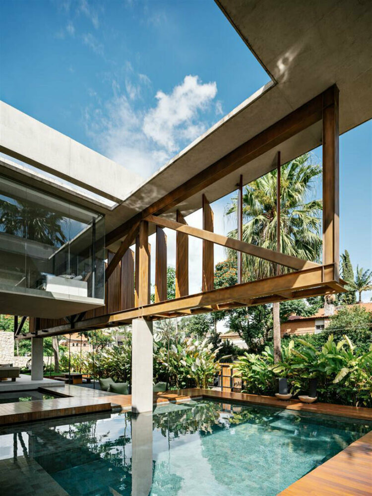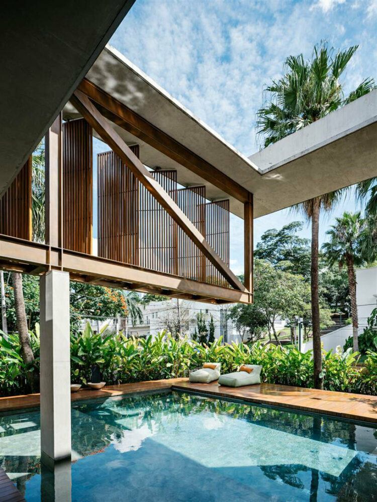 At Casa Cumaru, FGMF Arquitetos’ structural ingenuity takes center stage. The upper floor’s suspended volume is a true marvel, where four concrete pillars provide essential support for the porticos on one side. On the opposite side, two pillars suspend a remarkable 22-meter-long metal truss. This truss serves as both a structural necessity and a canvas for creativity, featuring a facade adorned with movable wooden shutters known as brises. This assemblage serves a dual purpose — while contributing to the building’s aesthetics, it further serves to provide passive shading, an important cooling element in the sun-soaked climate of São Paulo.