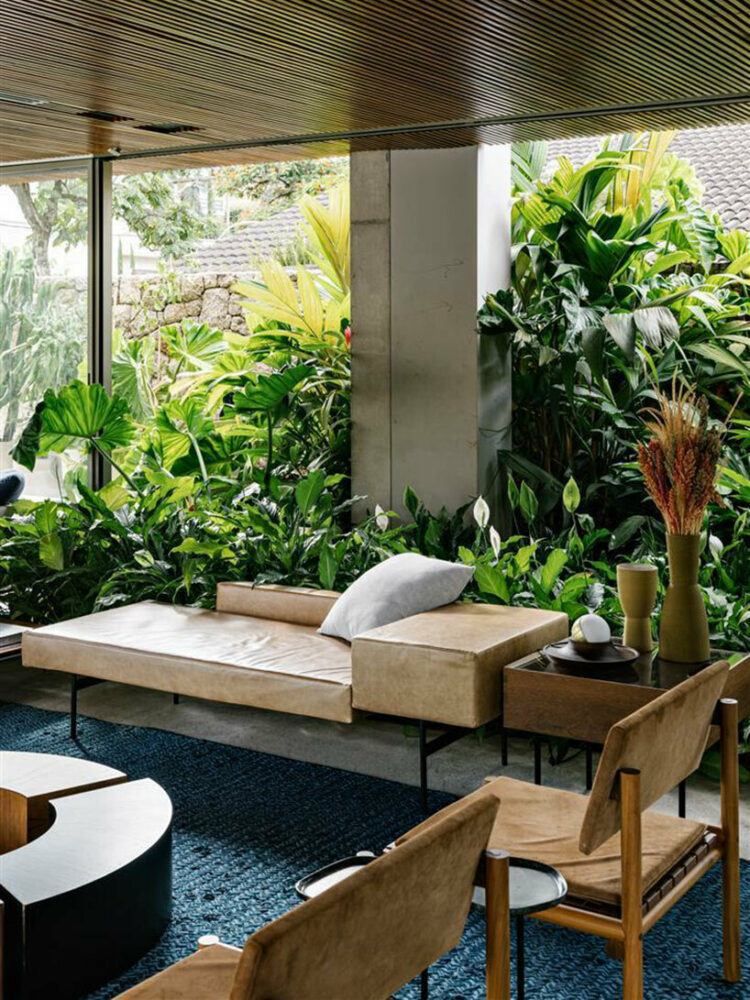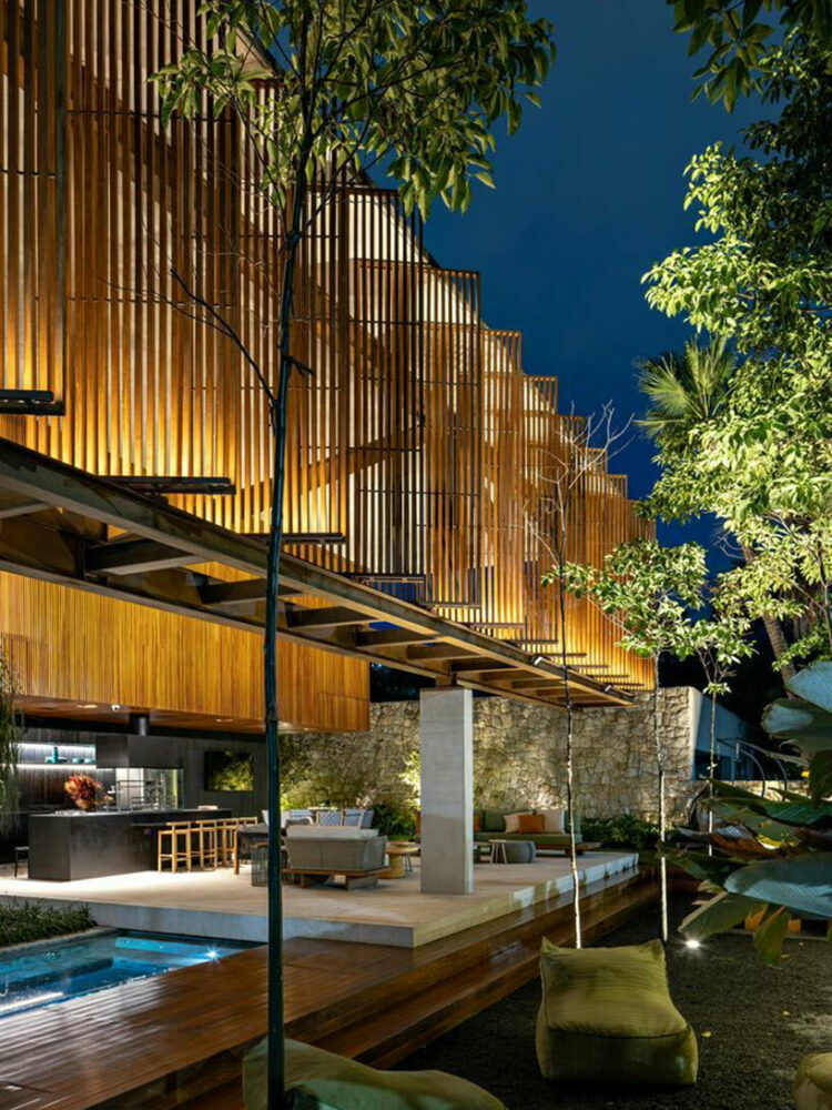 The namesake element of Casa Cumaru is the generous use of cumaru wood. This distinctive wood species is the driving force behind the project’s name, and its presence is felt throughout the property. Slatted cumaru wood cladding envelops the structure, adding warmth and texture to the facade while establishing a rhythmic frame for the lush landscaping which fills the site. The prominence of wood blurs the boundary between the interior and the gardens, further enhanced by the thoughtfully integrated plantings that seamlessly meld spaces separated only by full-height sliding glass panels.