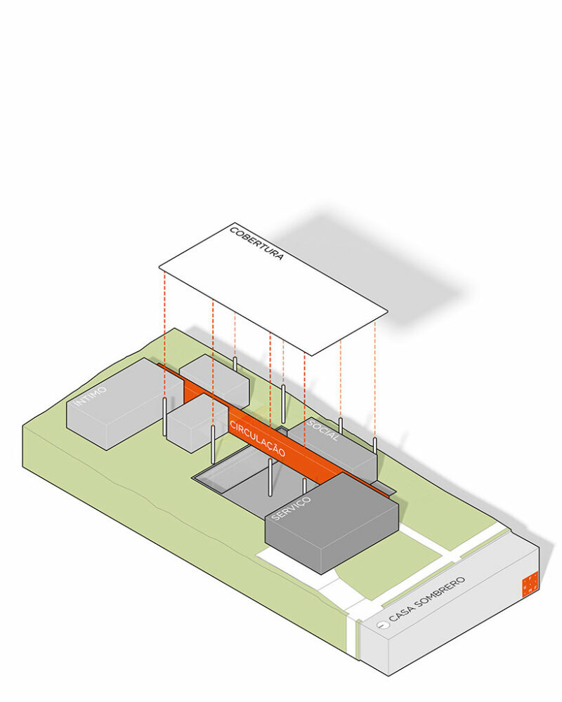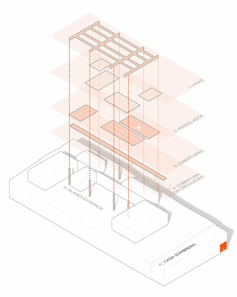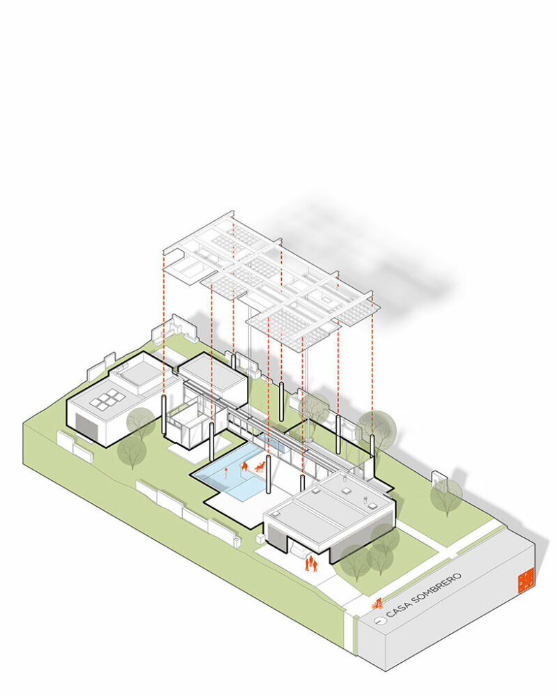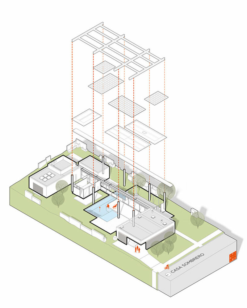 the project sits like a ring placed over the terrain, with its funnel-like roof forming a shaded perimeter walkway and an introverted core.