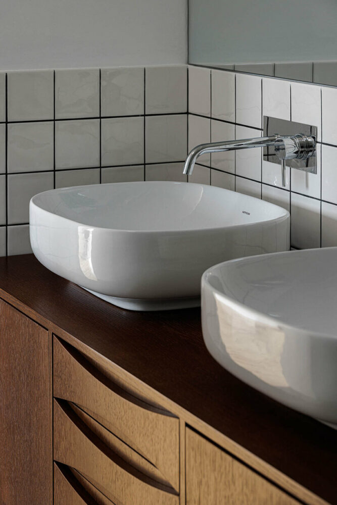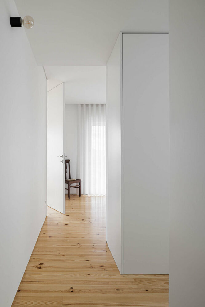 Program-wise, the dwelling spans two levels, with the main access to ‘Casa Caldeira’ assigned to the ground floor along the southern elevation. ‘It is on this floor that the whole social area is distributed in a connected space in shale masonry, bounded only by the pre-existing inner walls. On the first floor, the three-quarters are organized in a game of symmetries and rotations, where the meeting point culminates in a wide space for the natural landscape typical of the region,’ shares the architect.