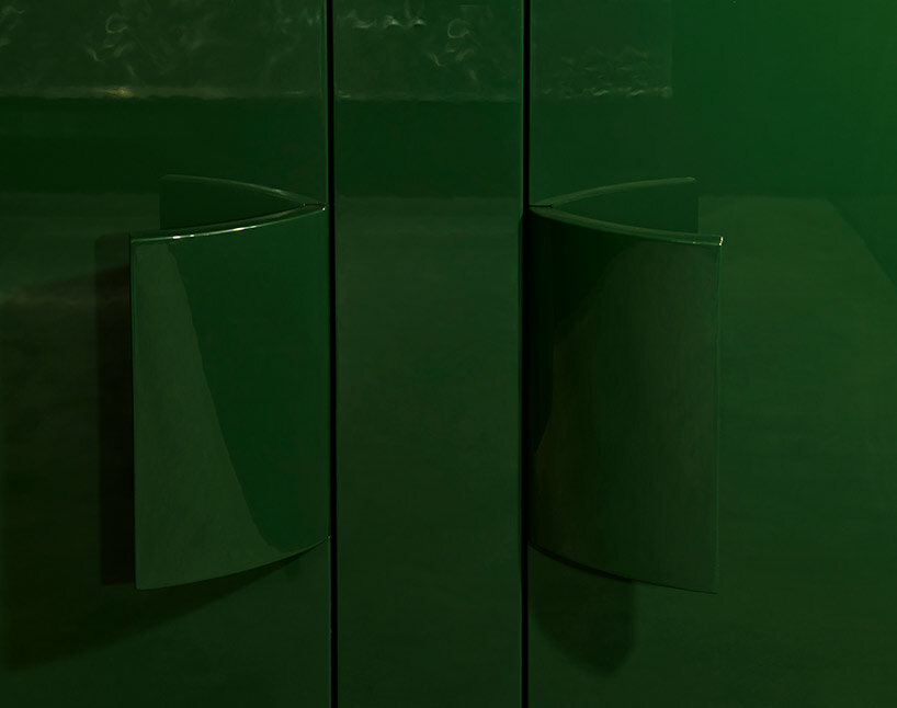 ‘From the deep jade green with lichen hues, and the felted tones of the thick carpeting, the creator’s 70s inspirations are for the first time brought to the fore. A space from another era. An anachronistic wink, hinted through the reflections of the soft light on the lacquered walls.’