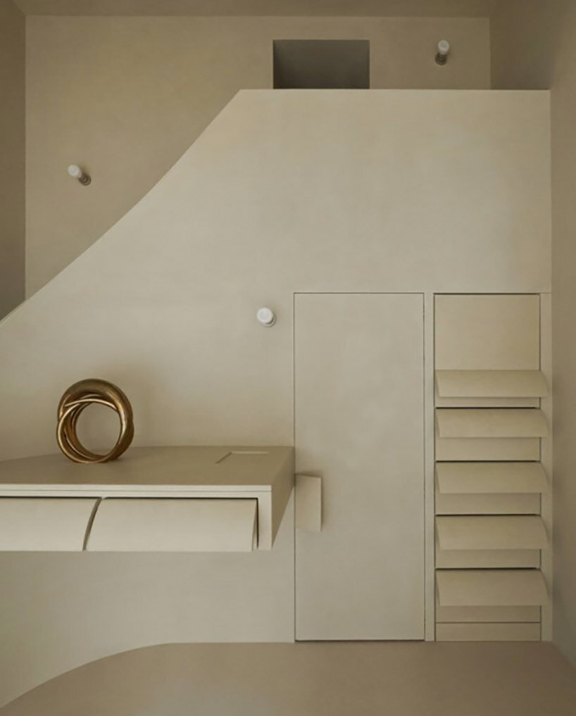 The exhibits are nestled within the transparent acrylic mass, in a series of carved-out cabinets and drawers, which makes them appear as if they are floating on ice. ‘Drawers and cabinets are carved directly out of the natural grooves and relief of the artificial material, further underlining its highly contemporary yet historical feel,shares the architect. Natural light penetrates the storefronts enabling the sinuous architectural pieces cast subtle shadows on and within the acrylic wall.