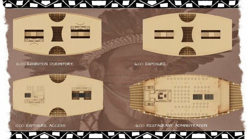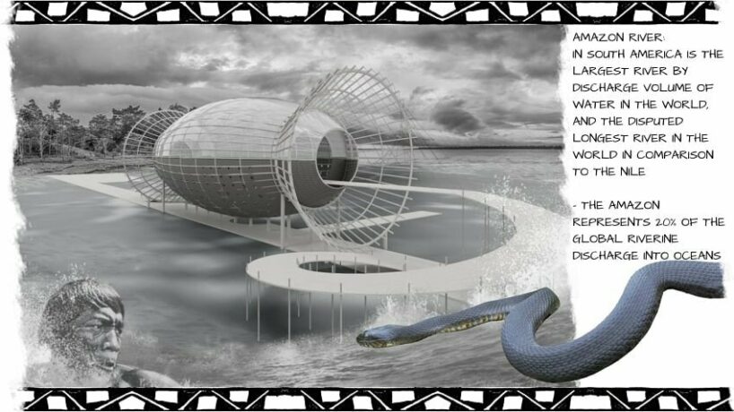 Located on the banks of the Amazon River, Amauri Gaspar visualizes a fish-trap shaped pavilion which preserves and revives the memory of indigenous culture. Celebrating the community’s rich heritage and way of life, the large curving structure houses within it facilities to preserve the region’s rich marine and bio diversity, united with distinctive tourism experiences.