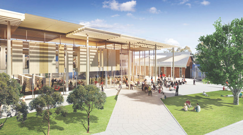 australian design practice francis-jones morehen thorp have submitted one of three shortlisted entries for the new marrickville library competition. the proposal for the new library is a vernacular community area that incorporates the surrounding green region into the interior. instead of just designing the building, the entire site is taken into consideration with outdoor fixed furniture, wireless laptop zones, a public performances amphitheater and a terrace by the cafe. the heritage buildings onsite are combined into the usable space after their restoration back to their original state.