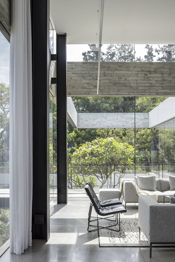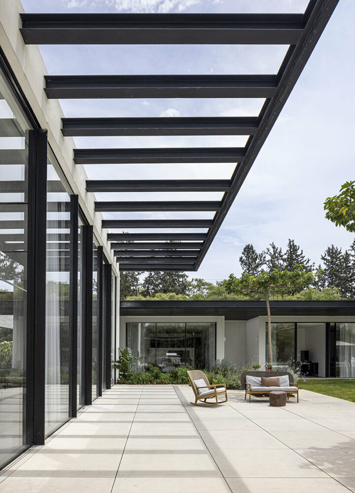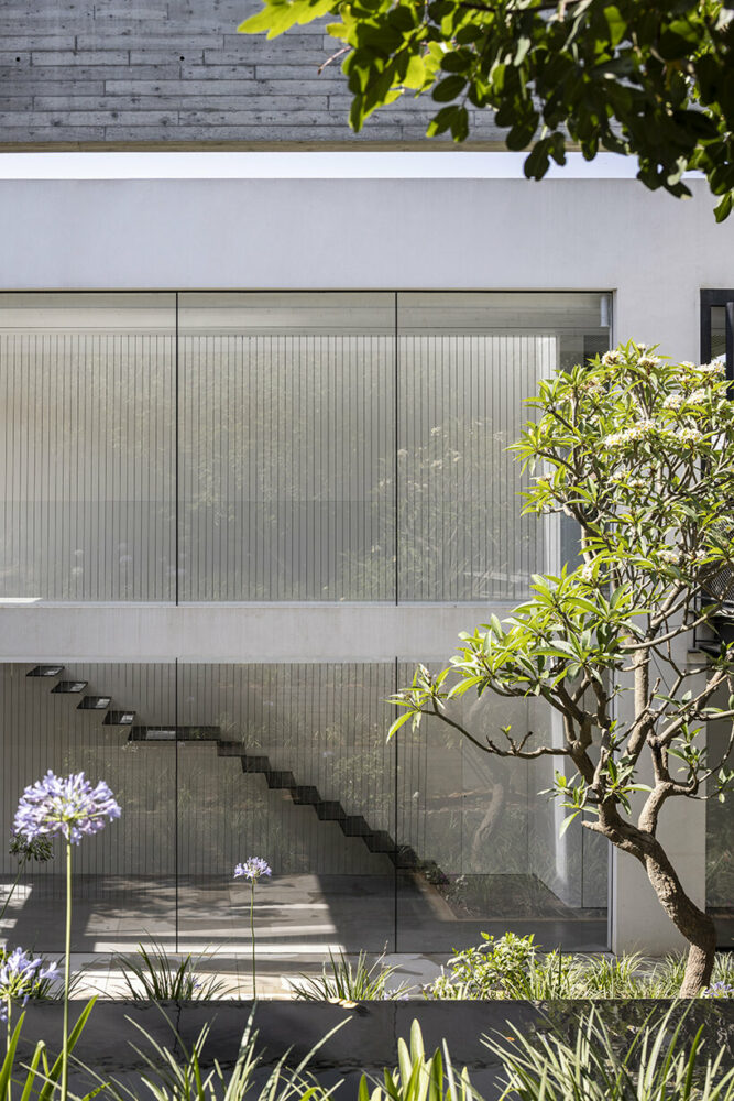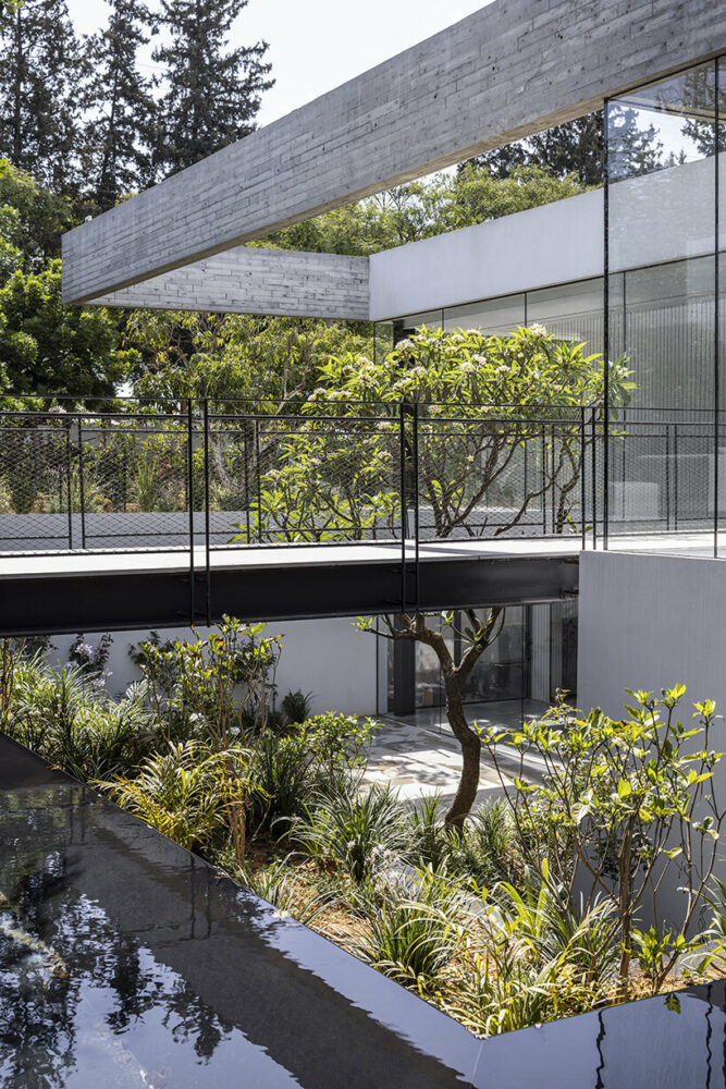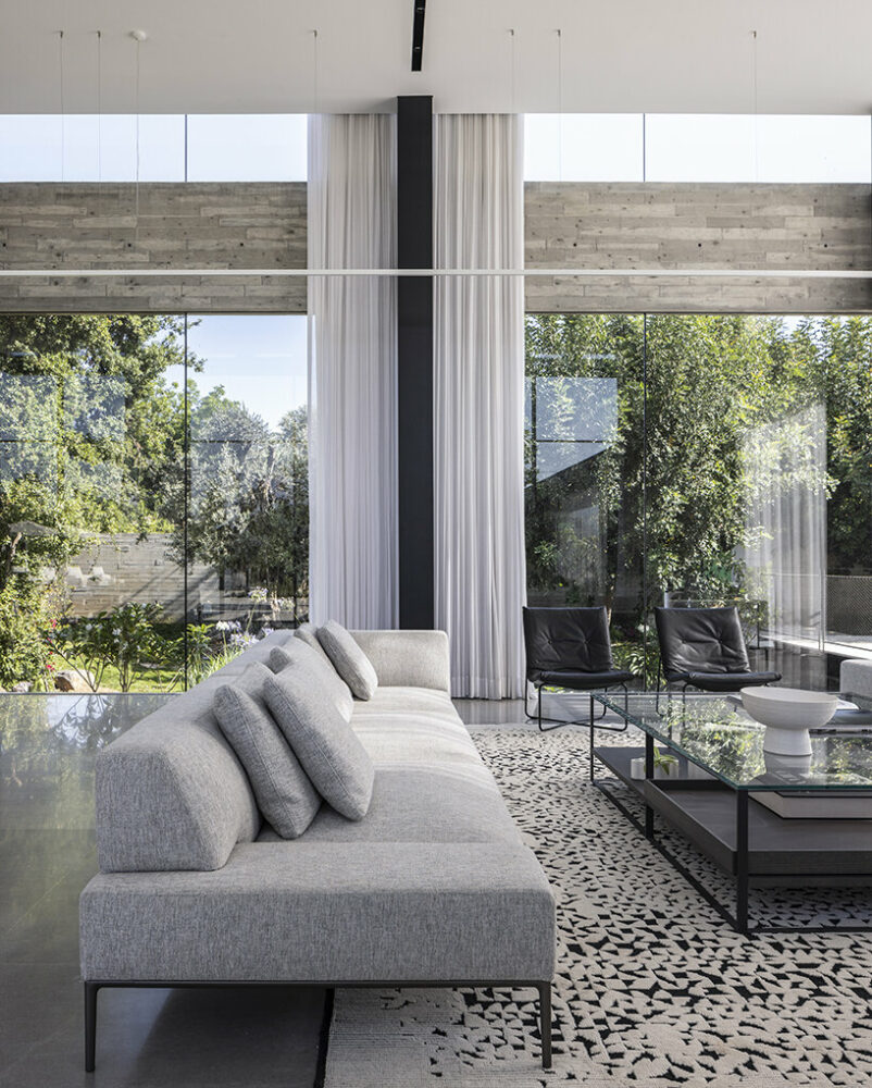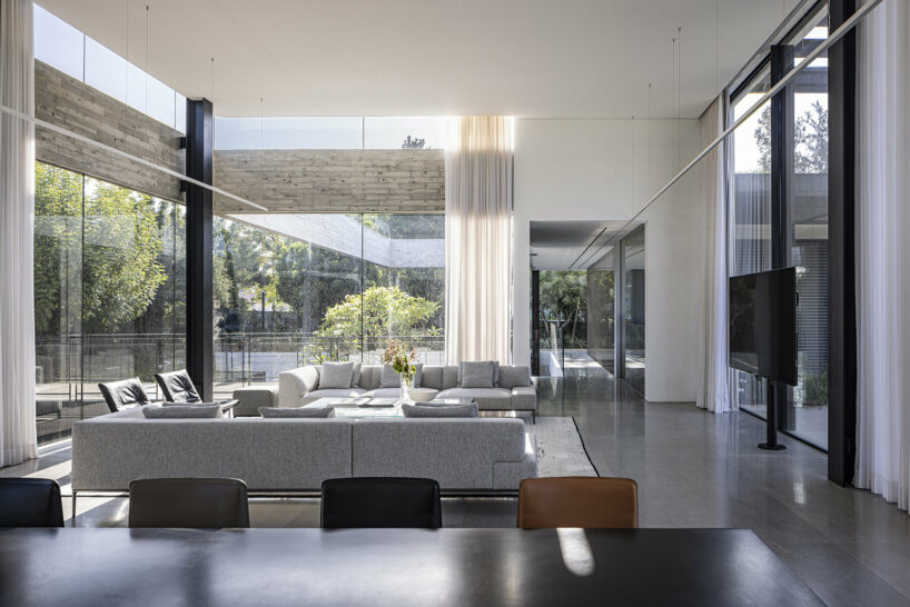 Wrapping dramatically around the main spaces of Z3 House by Raz Melamed (see more here) is a floating concrete beam that ‘protects’ it from passersby while creating a uniform facade in the form of an airy and partially sealed-off membrane. Meanwhile, a patio sits between the wings in the corner, overlooking the street and separating a yard to the basement, above which hovers a bridge from the main entrance. The beam is reflected in the pool below, which the architect sculpted in the shape of black terraces that descend toward the basement. ‘These create an encounter with the vegetation patio that creates privacy, as well as curtains that are spread over the huge openings,’ notes Melamed. Above the patio, the entrance bridge leads to the main door, paved with stone that also extends to the interiors, signaling a prominent connection with the outdoors. This connection is strengthened through large windows that project the view inward, with the entrance in sight.