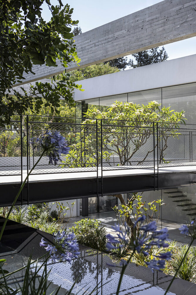 The lighting in the space is thoughtfully designed to complement its height, with recessed fixtures in the lowered corridors and a recessed strip on the ceiling, creating an elegant play of heights and seamless continuity. The white hanging strip, in combination with the black recessed lighting strips, adds a touch of sophistication to the ceiling design. To the left is a private area where all bedrooms offer a meditative pool view. Access to this area is provided by a bridge with cable railings on one side, connecting the floors. The cable railings extend from the floor to the basement and the son’s suite, reaching the ground floor ceiling. On the other side, a double space overlooks the patio, further emphasizing the yard’s openness without confining walls.