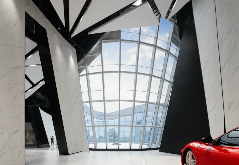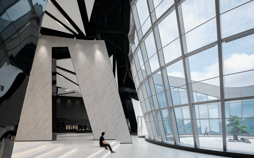 The architects have also created an exterior facade composed of large-scale ceramic slabs and transparent curtain walls. The slabs are based on ‘SIMM-TEC’ technology developed and produced by Nabel. The vertical solid plates and glass curtain walls highlight the topographical sense of the building while establishing an interesting rhythmic pattern.