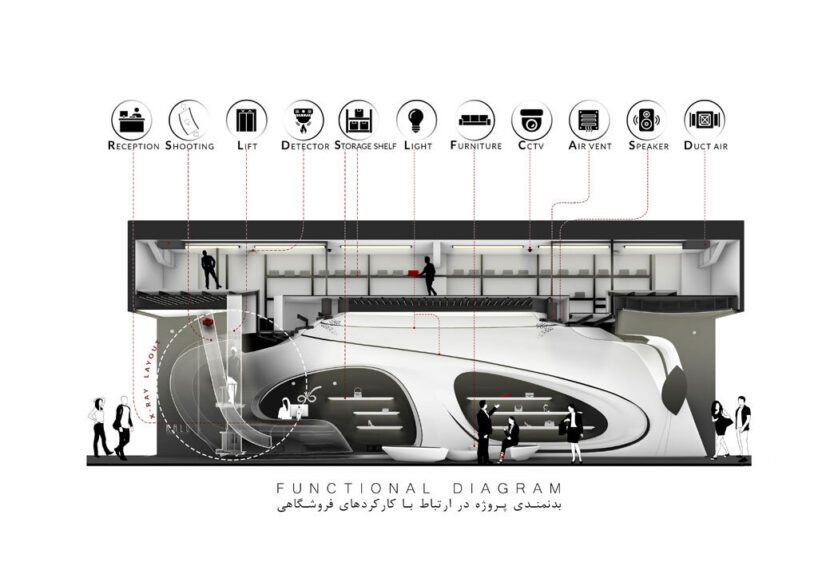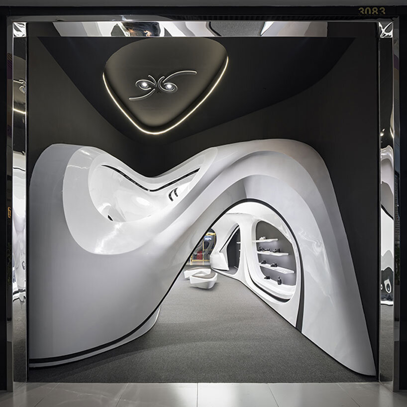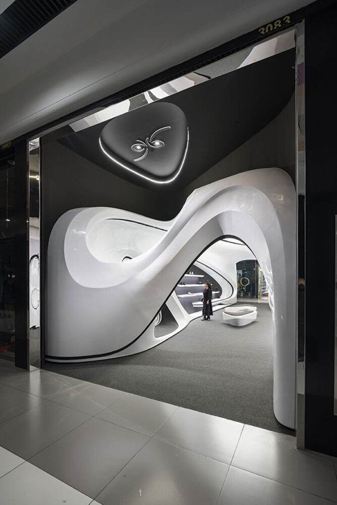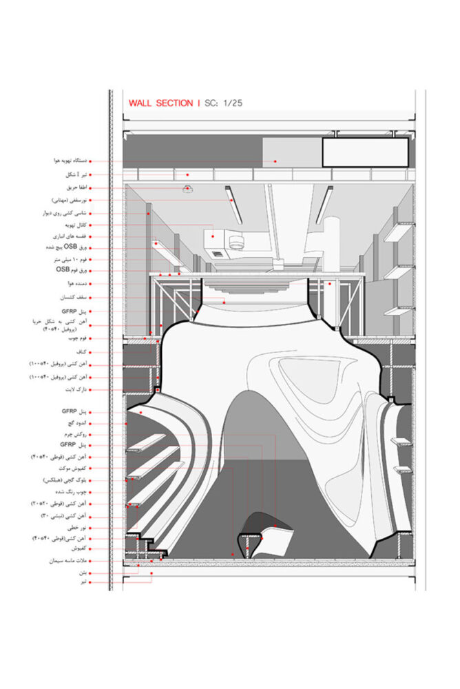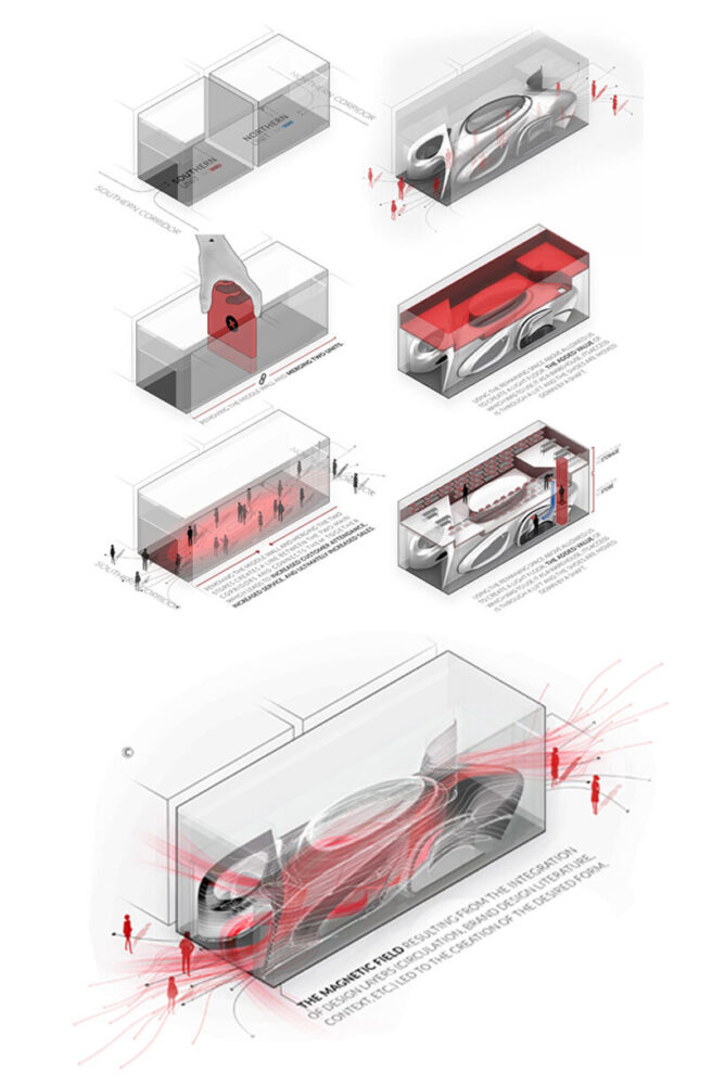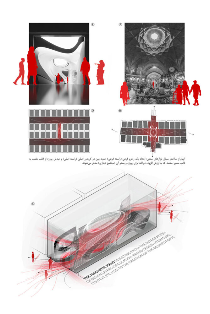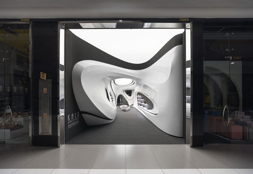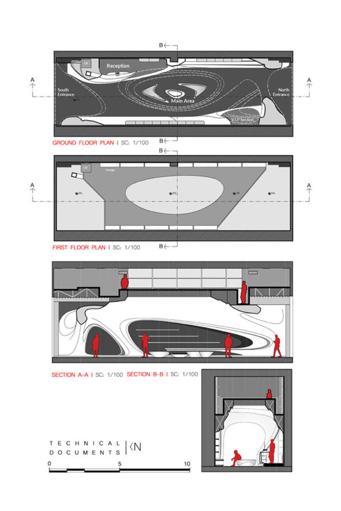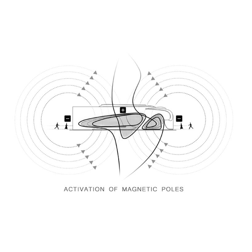 the project sits like a ring placed over the terrain, with its funnel-like roof forming a shaded perimeter walkway and an introverted core.