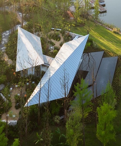 folded triangular roof planes shape luxerivers café along china's yangtze river