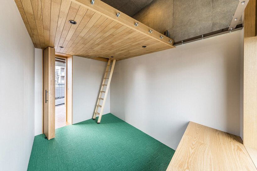 led by mai komuro, KOMPAS performed an elaborate analysis and studies of the site’s conditions and limitations to make use of its full potential. despite the low floor area ratio allowance, the maximum building height of the site is defined at 20 meters if the volume is adapted to the complicated shadow calculation. however, most of the buildings nearby are kept lower than 10 meters to avoid extra code compliance processes. while the neighborhood is relatively dense on the street level for residential use, the architects found potential open voids to create comfortable environments above the surrounding low buildings. therefore, the concrete residential building was developed to be taller on the northern side, elevating the duplex residence higher than neighboring roofs while maximizing the building volume and capturing open views of the surroundings.