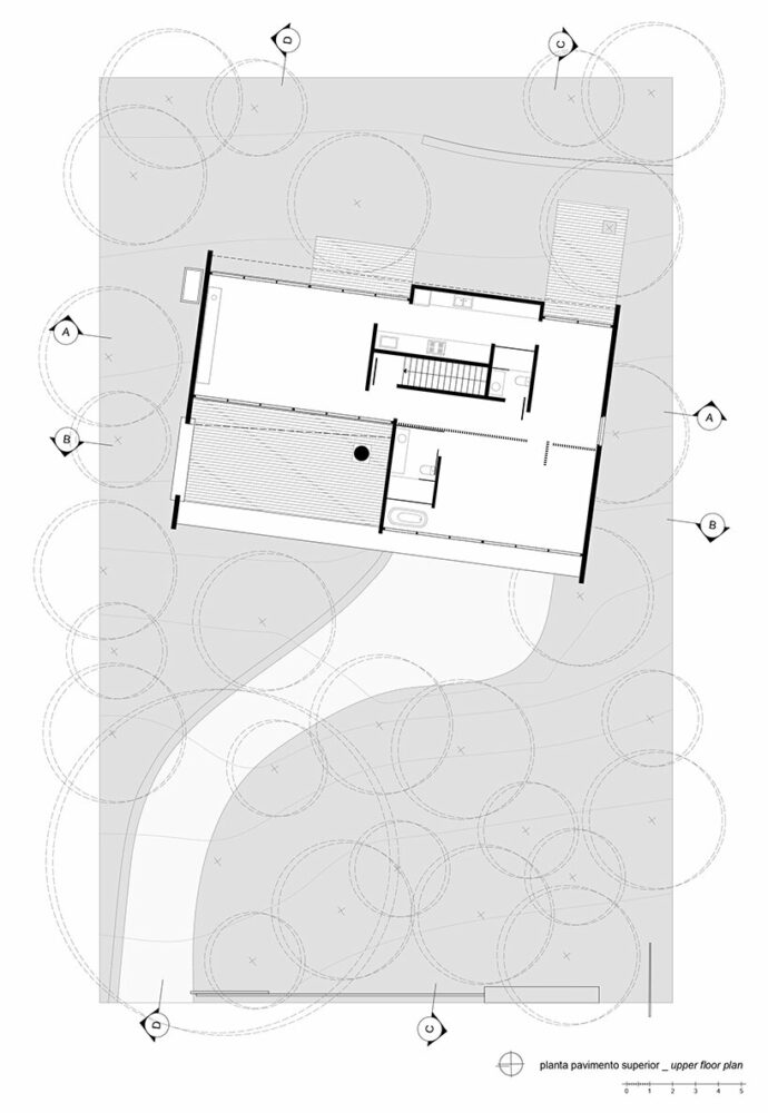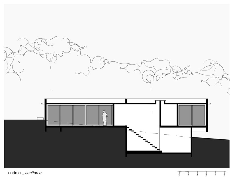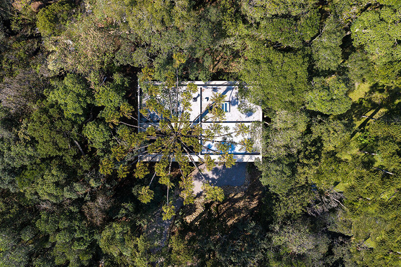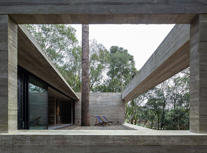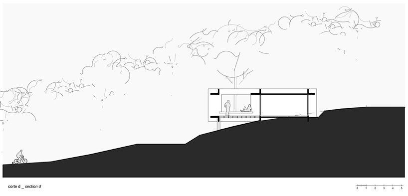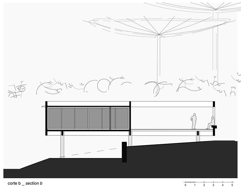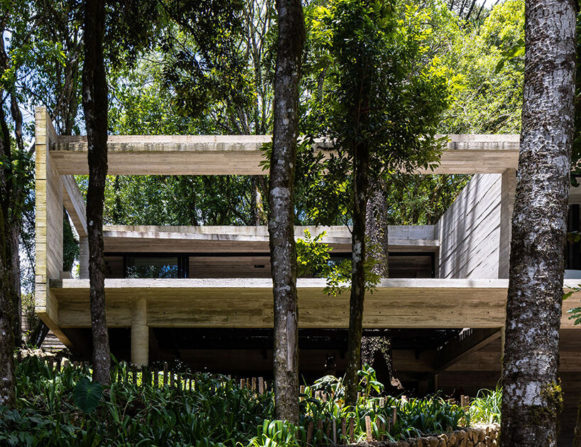 the project sits like a ring placed over the terrain, with its funnel-like roof forming a shaded perimeter walkway and an introverted core.