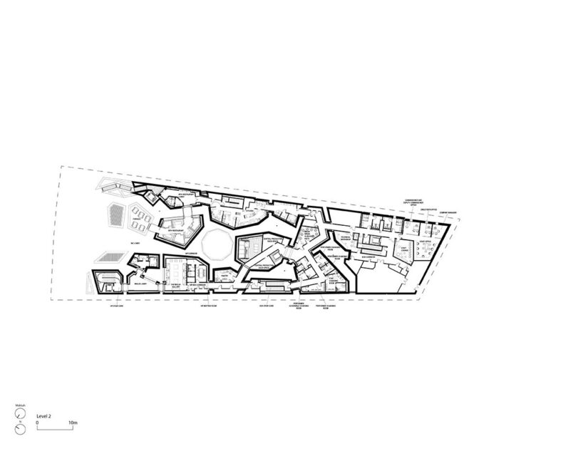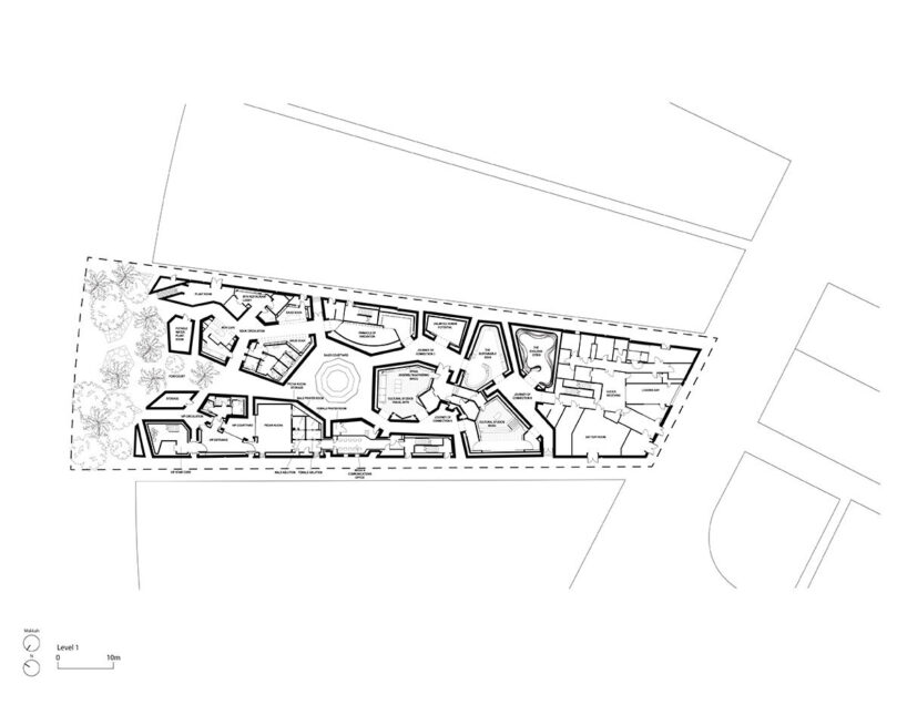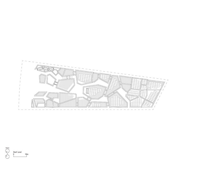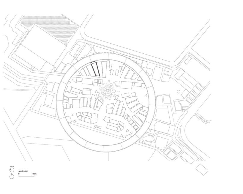 the project sits like a ring placed over the terrain, with its funnel-like roof forming a shaded perimeter walkway and an introverted core.