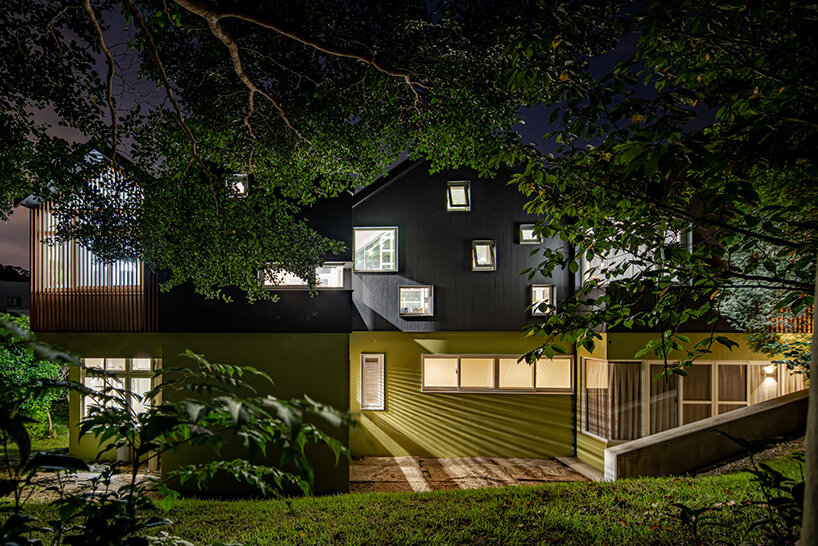 the team at emerge architects & associates (find more here) designed a continuous form of four gable roofs in various sizes and inclines to top the residence. as a result, the project adopts an iconic volumetry that stands out among the surroundings. at the same time, the multiple peaks of the roofing serve as a reference to the nearby mountains, thus helping the dwelling integrate into the local landscape.