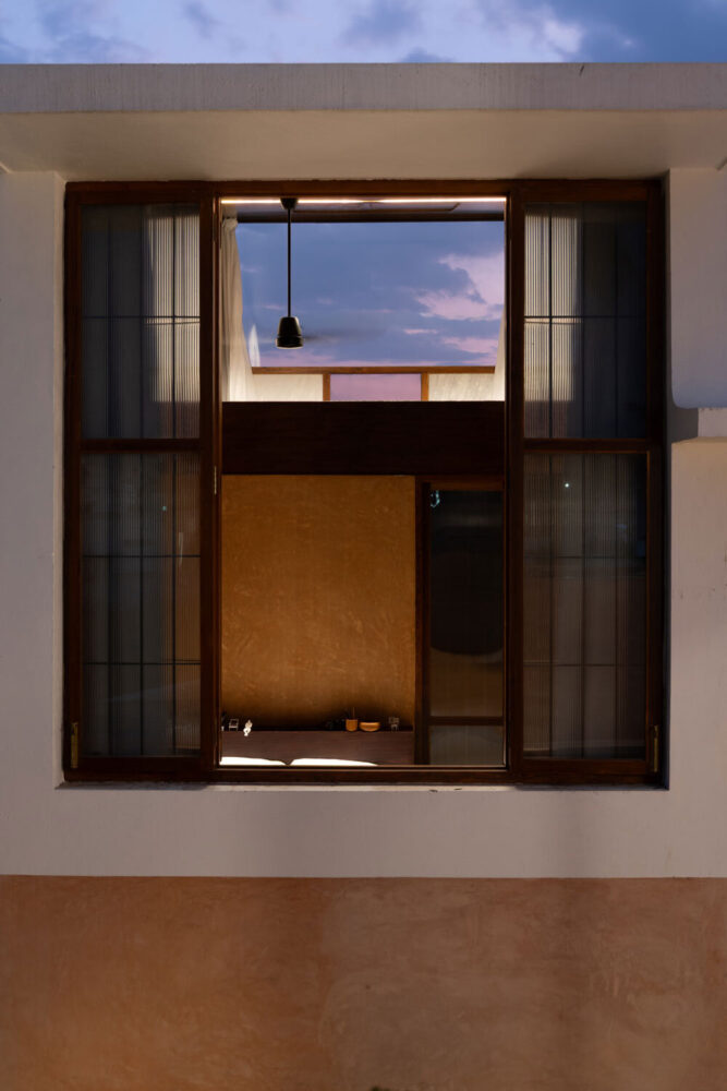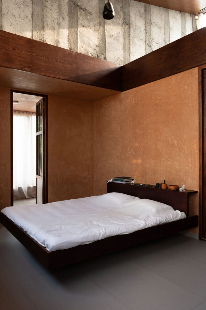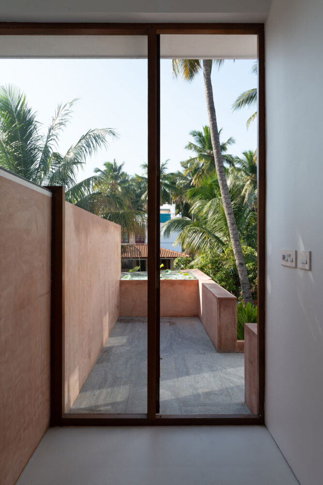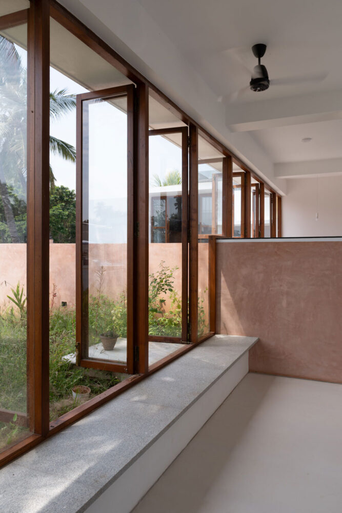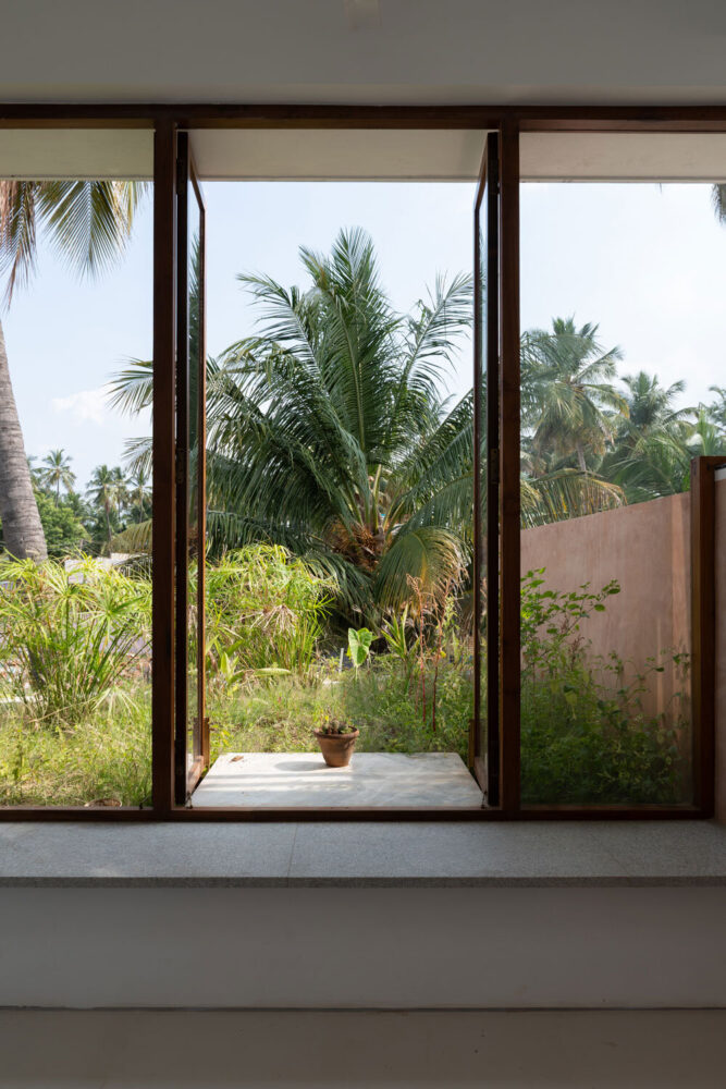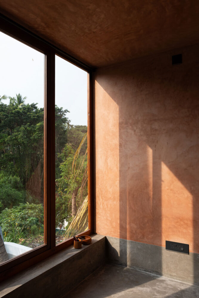 Material selection is closely tied to site conditions and local availability. Reclaimed bricks from an existing boundary wall and soil excavated on site are combined with lime plaster to create breathable wall surfaces that support thermal regulation. The resulting earthen finish reflects light softly and reinforces continuity between interior and exterior spaces. Reclaimed Burmese teak from dismantled regional structures is reused for doors, windows, and structural elements, minimizing new material use while maintaining durability. A final plaster layer incorporates black oxide and crushed plant seeds, referencing earlier site markings and integrating subtle traces of past use into the building fabric.