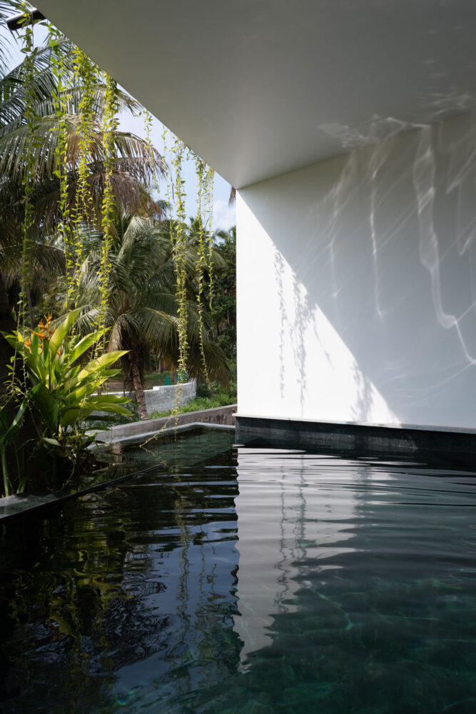 The first spatial sequence interprets childhood experiences of movement through garden paths, grass trails, and shaded thresholds. This memory is translated into a linear courtyard defined by high enclosing walls and layered planting. The narrow proportions and vertical enclosure replicate the sensation of moving through tall grass, while filtered daylight produces a subdued, dappled light condition. The courtyard functions as both a climatic moderator and a connective space, allowing seasonal changes to be perceived throughout the house. Fixed, built-in seating elements replace movable furniture, reinforcing a direct relationship between body and structure. The second narrative centers on the kitchen as the social and sensory core of the house. Referencing earlier domestic rituals associated with cooking, water, and shade, the design places the kitchen at the center of daily activity. A partially shaded dip pool recalls a former water tank, while an elevated seating element introduces vertical variation and visual connection. Landscaping elements, including a palm canopy, generate filtered light and reinforce the kitchen’s role as a focal point. Spatial organization emphasizes proximity, movement, and sensory engagement rather than formal separation.