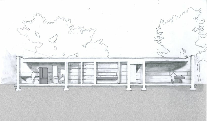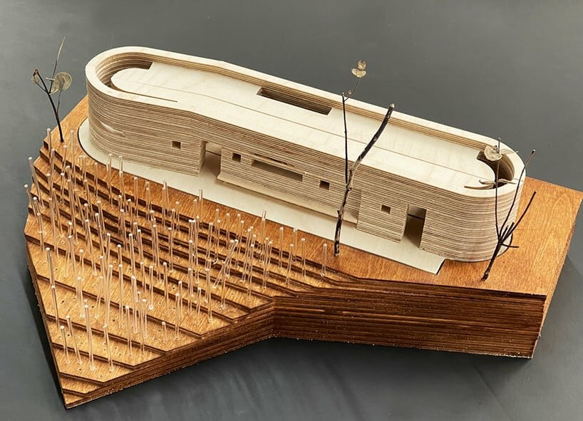 the project sits like a ring placed over the terrain, with its funnel-like roof forming a shaded perimeter walkway and an introverted core.