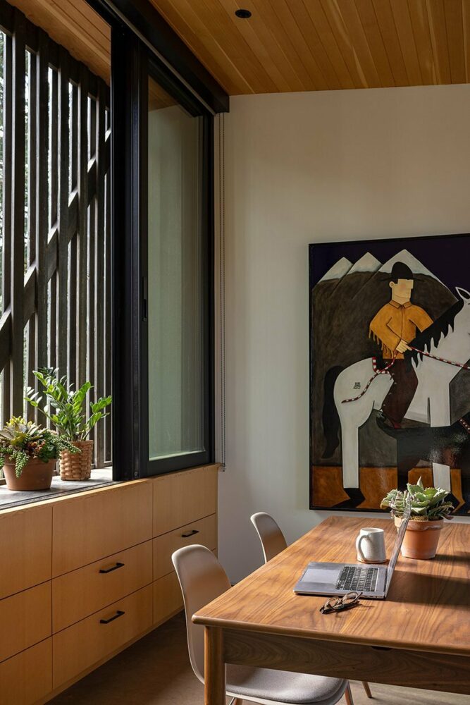 PBW Architects’ single-family residence ‘Big Fir Vineyard’ nestles on the hills of a designated wine grape-growing region in the Willamette Valley just outside of Portland. The topography and agricultural plan of the site inform the design of the small home that both takes in the surrounding landscape and becomes a part of it. The fragmented wooden form of the structure traces the sloping terrain as the roof shape mimics the incline of the site. Indoor-outdoor elements visually extend the interior spaces toward the newly planted vineyard, while the plan is oriented to harmonize with the rows of vines.