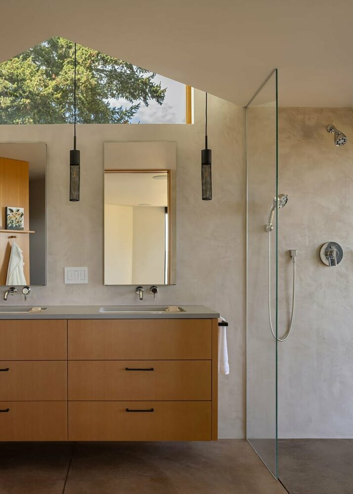 the main bathroom shower opens completely to the outdoors, sheltered by the wood screen