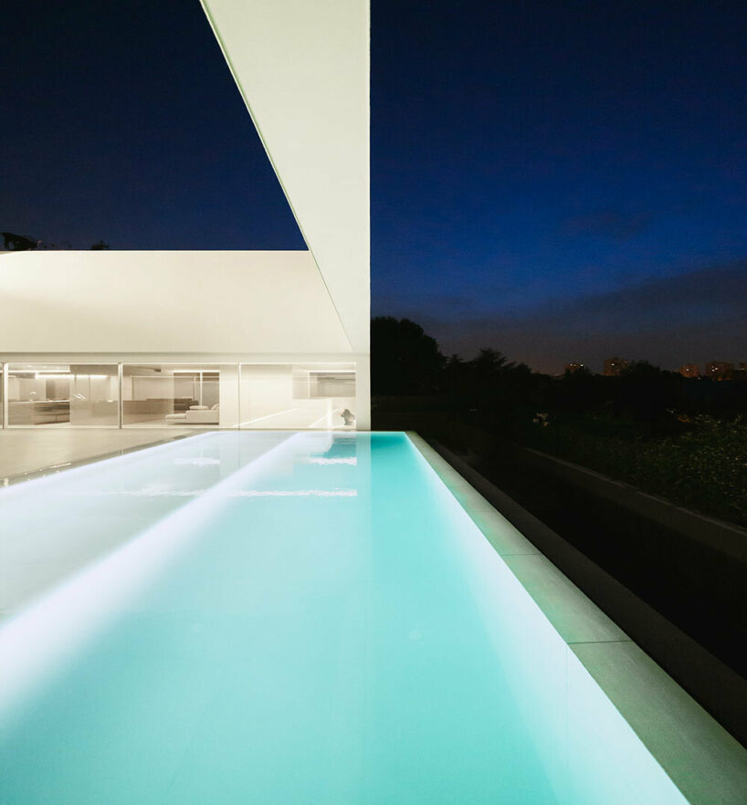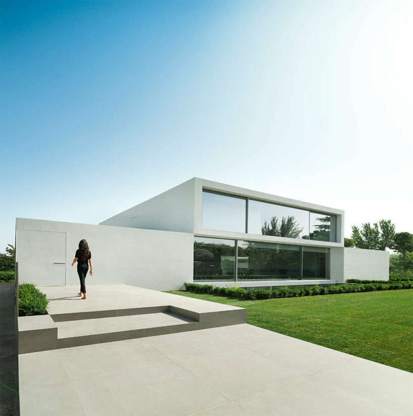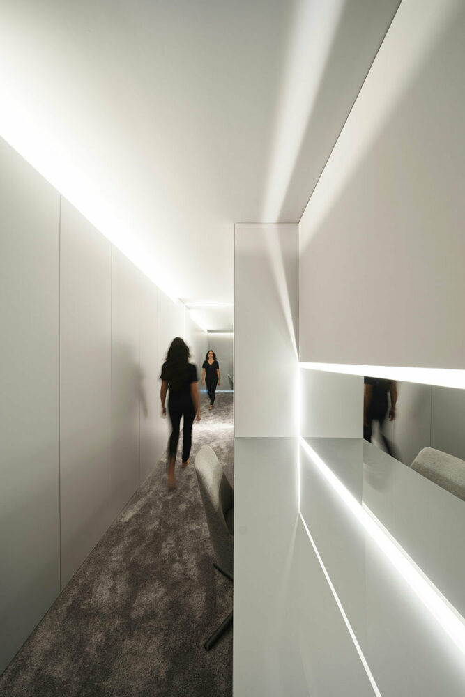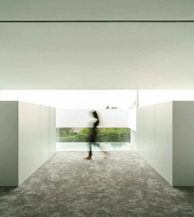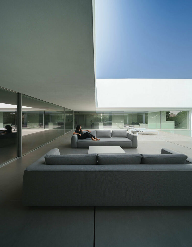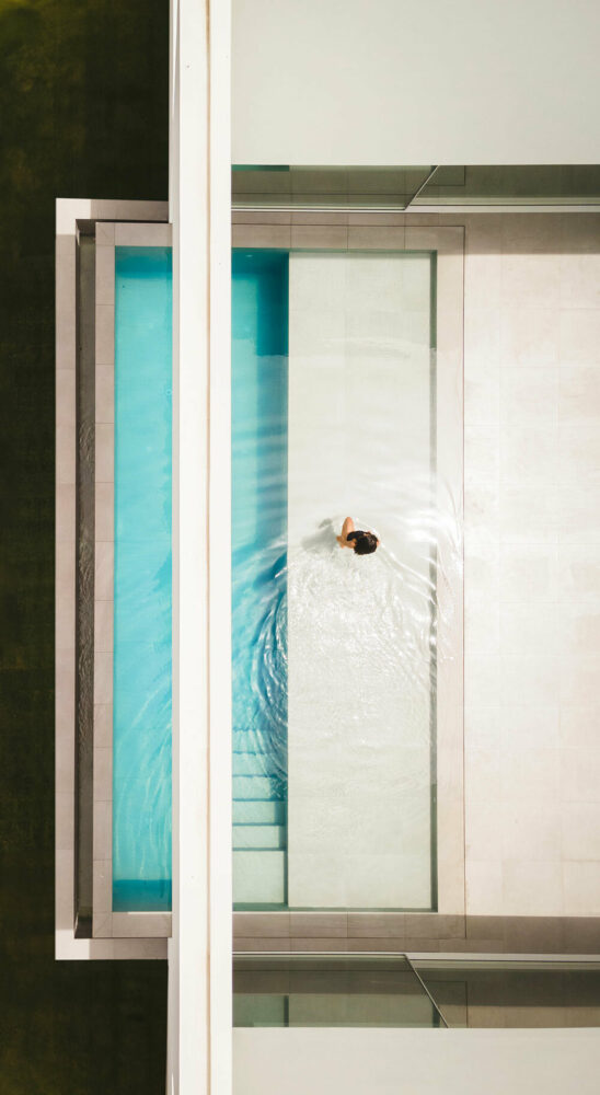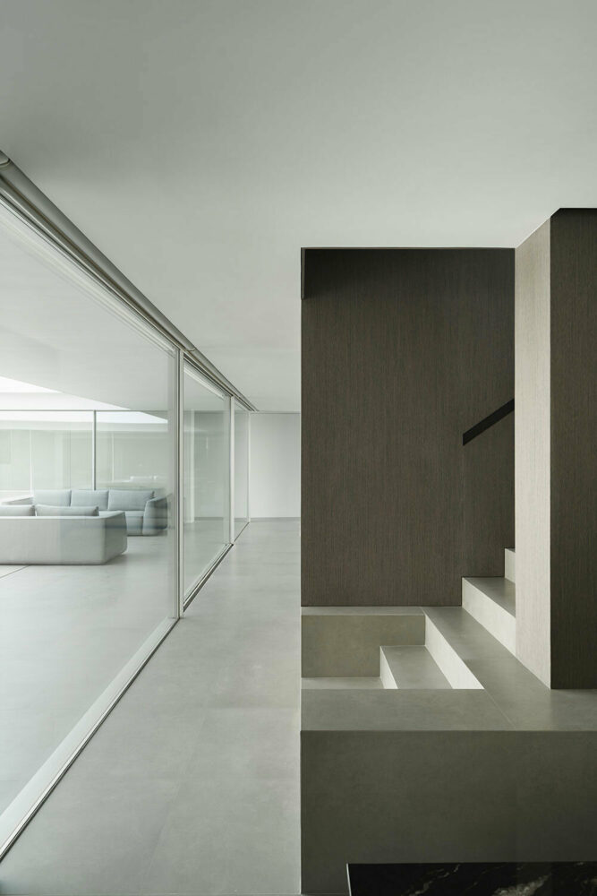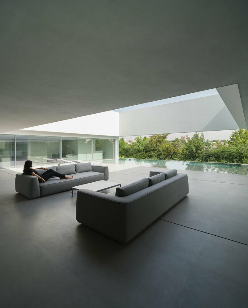 the project sits like a ring placed over the terrain, with its funnel-like roof forming a shaded perimeter walkway and an introverted core.