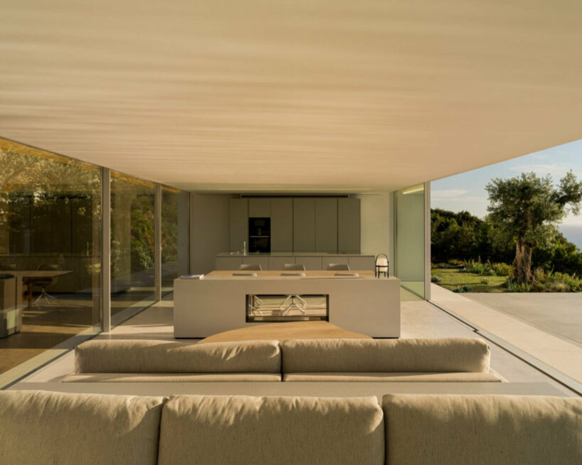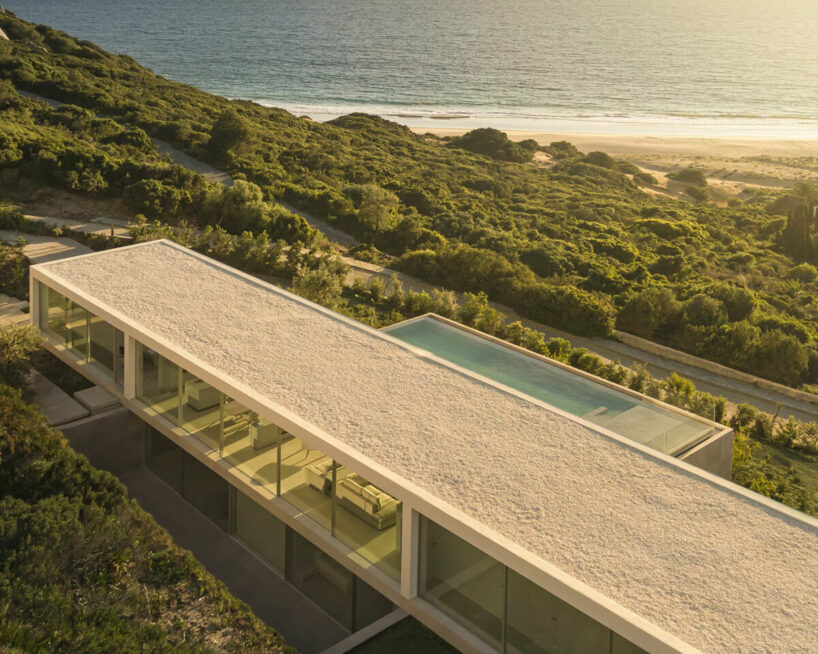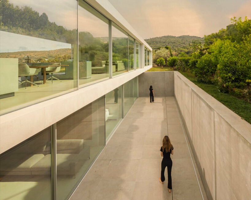 the project sits like a ring placed over the terrain, with its funnel-like roof forming a shaded perimeter walkway and an introverted core.