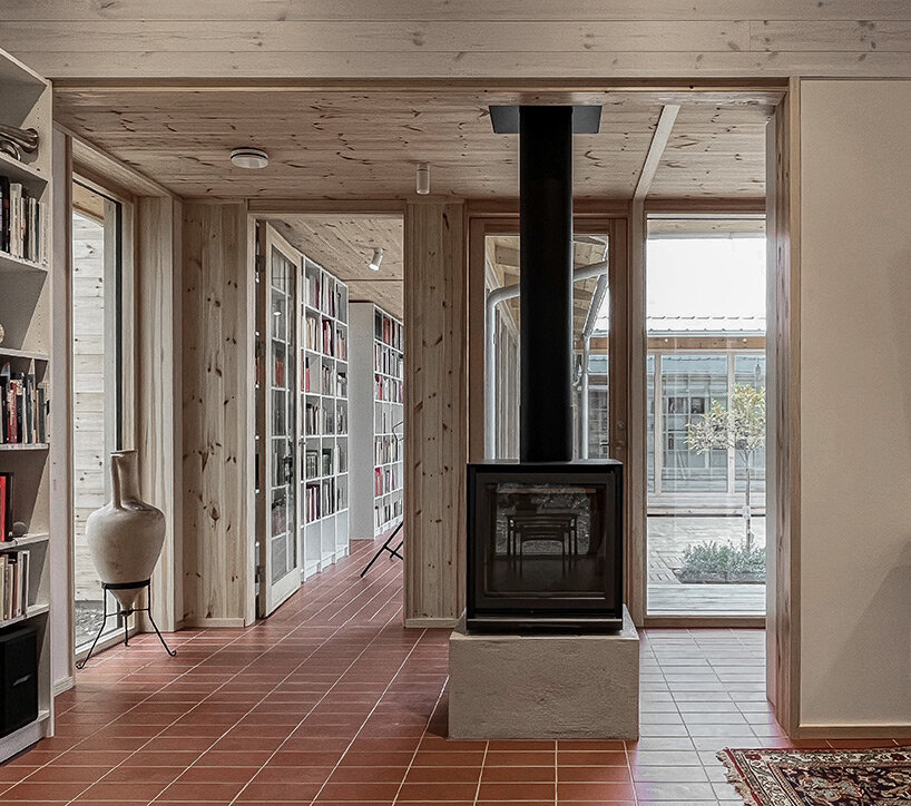 Architectural studio Fria Folket has designed ‘Library House’ for a ceramist and a lawyer with an extensive book collection. Located on the edge of a sparse pine forest by Lake Voxsjoen in Sweden, the building is organized around a library that frames a small courtyard and is designed to provide spaces for comfortable living, working, and creative activities.