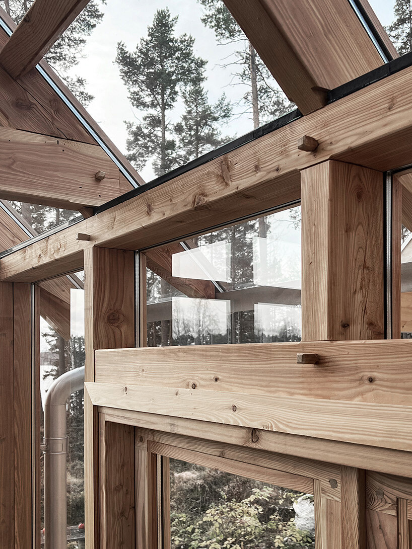 To reduce the ecological footprint, the walls and roofs were built without plastic and insulated with flax fiber, as is common in the area. The facade is clad in untreated pine from a local sawmill, and the concrete-free foam glass foundation was made from recycled glass. Rainwater from the roof is collected in an underground tank that supplies water to the greenhouse.