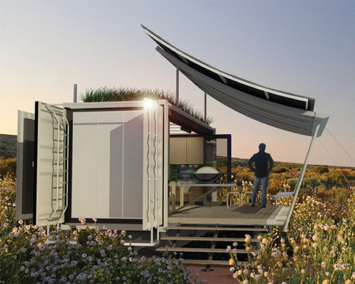 building upon their lineage of easily deployable structures made from shipping containers, the hong kong and australia based business G-pod has developed the self-sufficient and transportable home ‘dwell’. the pod employs a combination of patented pull-out sections and a large fold-down deck to offer three times the amount of usable space. the design is focused on environmentally conscious living, and operates off power grids and water mains. a large curving photovoltaic array functions to produce energy for the unit, while also shading the volume and thus reducing thermal gains.
