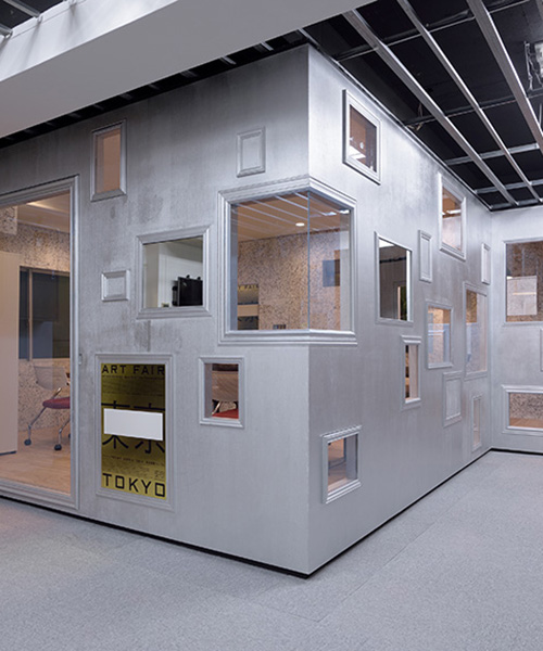 considering the client, a concept was developed comparing the office to an event space where the everyday routines of work are put on display. the three boxes: a private workspace for the chief director, another for the president, and a meeting room for all, are where the idea comes to fruition. a range of frames — some opaque, others glass, and more containing actual images — are cut through the internal walls of each box. this creates an interesting spatial experience, that present an always-changing array of views that are the ‘art’ of quotidian existence.