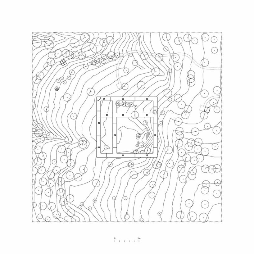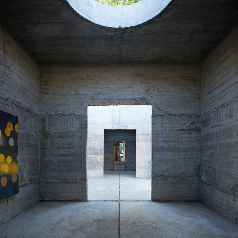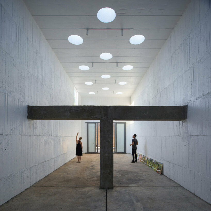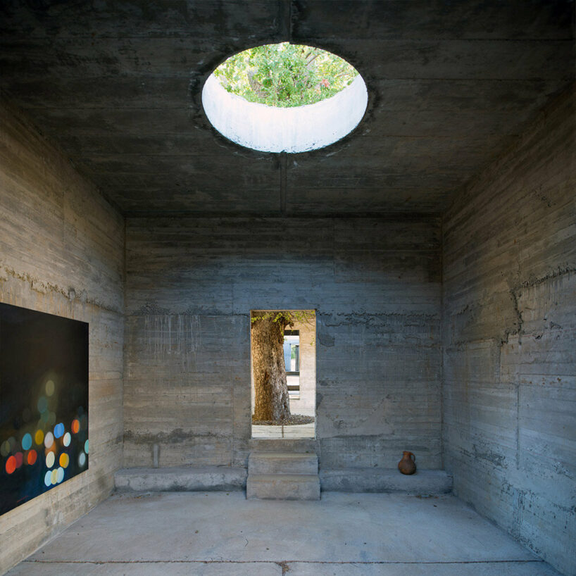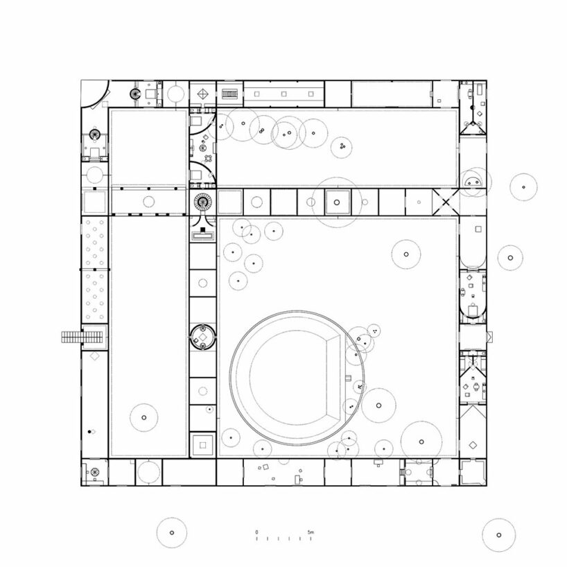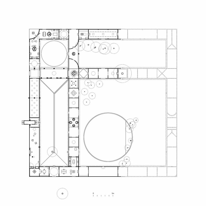 the project sits like a ring placed over the terrain, with its funnel-like roof forming a shaded perimeter walkway and an introverted core.