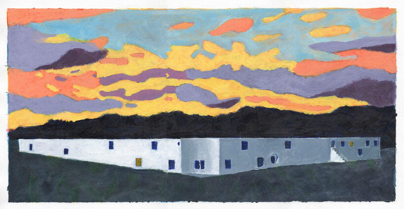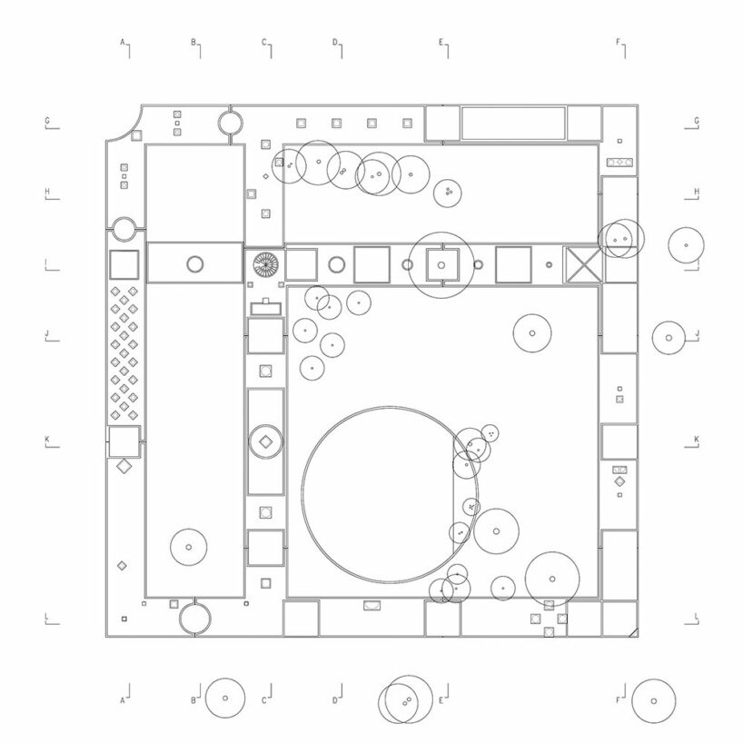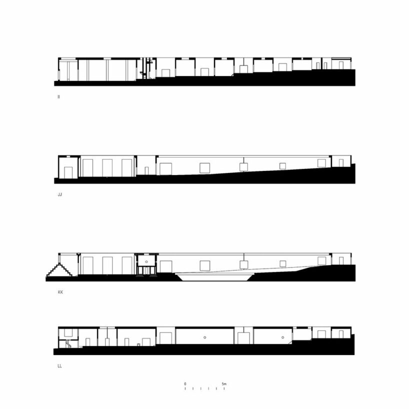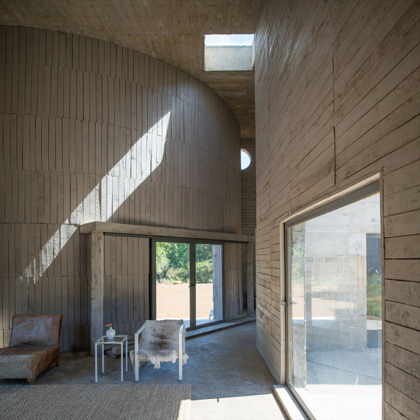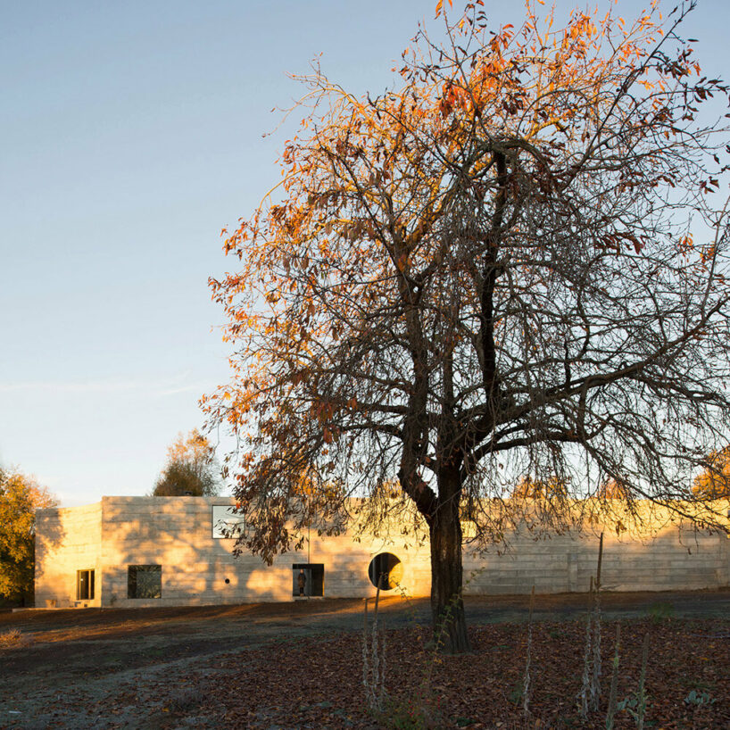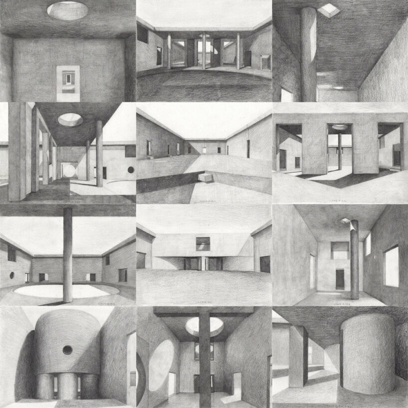the project sits like a ring placed over the terrain, with its funnel-like roof forming a shaded perimeter walkway and an introverted core.