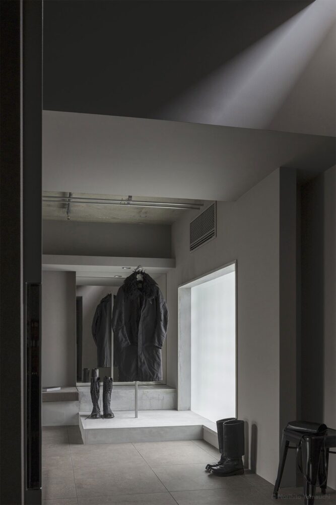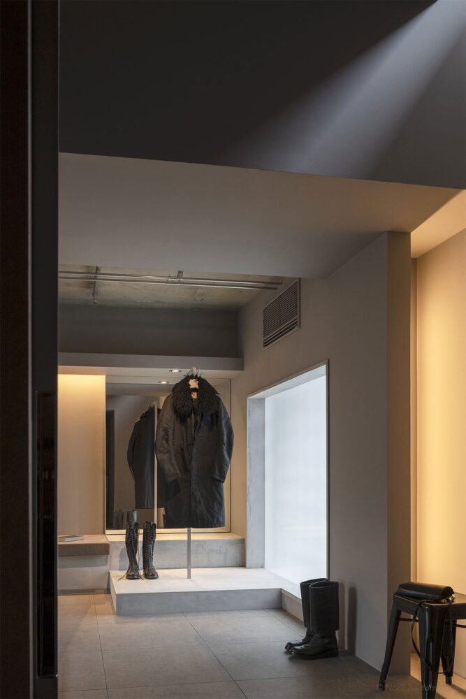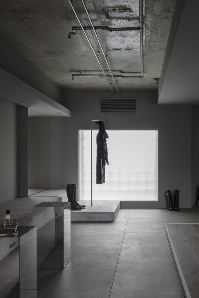 At the entrance hall, a recessed wall is positioned in front of a glass block surface. Embedded frosted glass further diffuses daylight, allowing the underlying grid of the glass blocks to appear as a soft pattern. In front of this surface, a garment from the client’s fashion brand collection is displayed, treated as a sculptural element and highlighted by the filtered light.