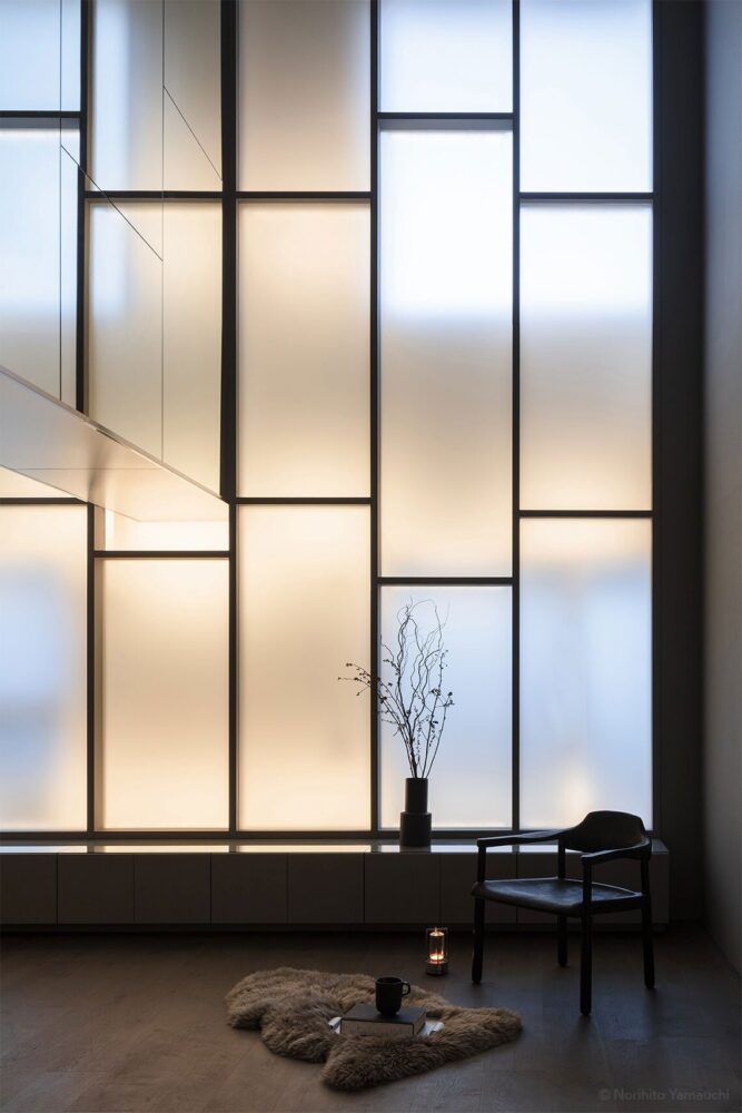 geometric frosted glass screens filter daylight within renovated room 1101 osaka apartment