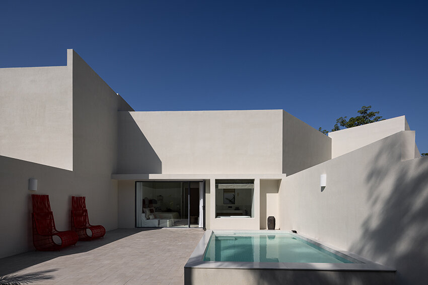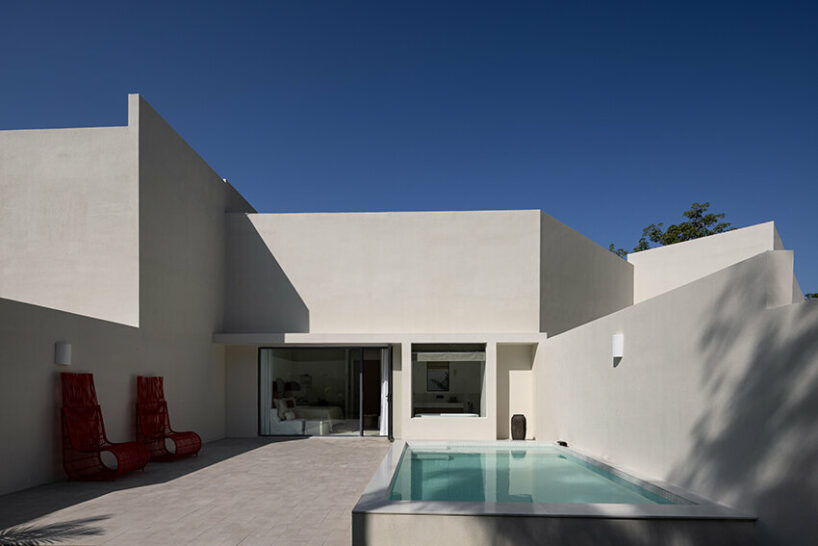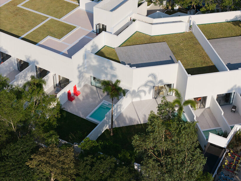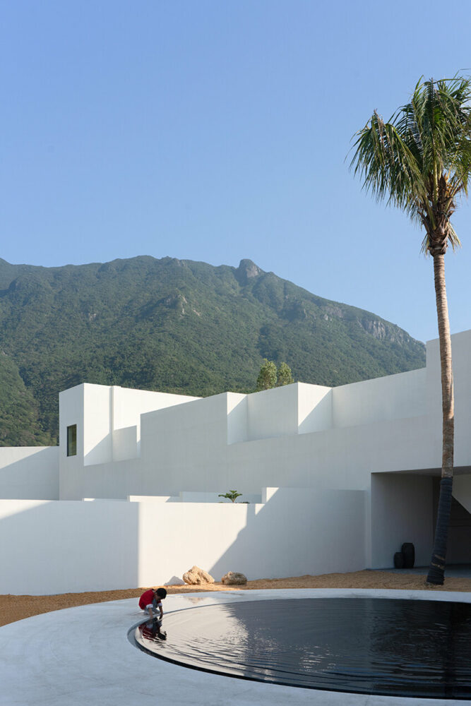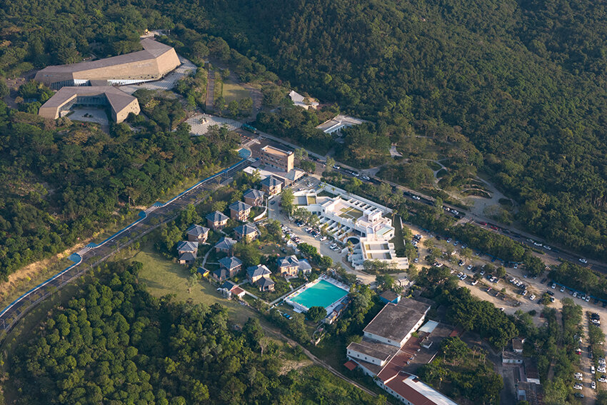 the project sits like a ring placed over the terrain, with its funnel-like roof forming a shaded perimeter walkway and an introverted core.