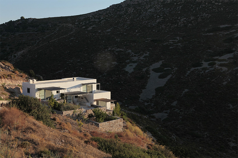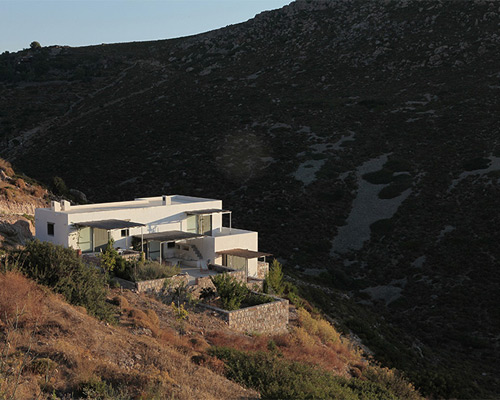 near the village of kambos, in the middle of the aegean sea is a home by georges maurios architecture. 300 meters from the beach, the 140m2 residence can accommodate up to six people. the dwelling is split into four levels, connected by internal and external stairs. each of the three bedrooms has a private bath and accompanying pergola covered terrace. it is made of exposed whitewash concrete, and terrace retaining walls are constructed with local stone masonry.