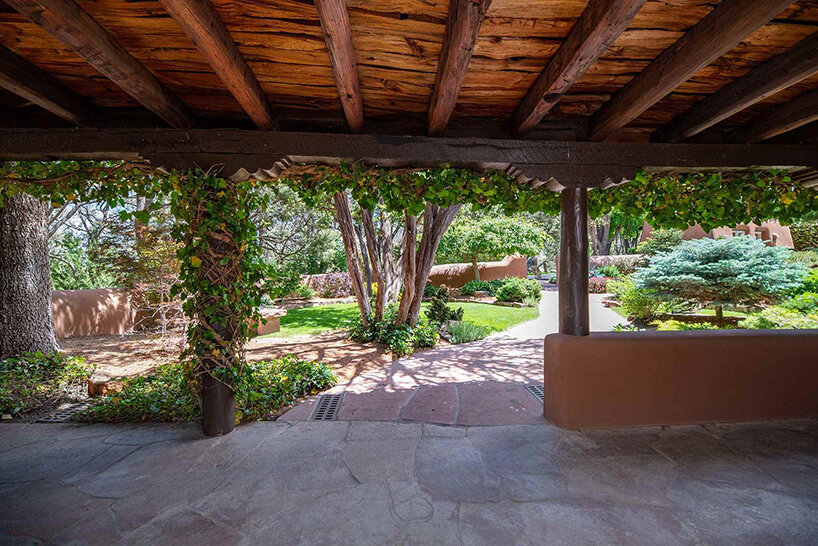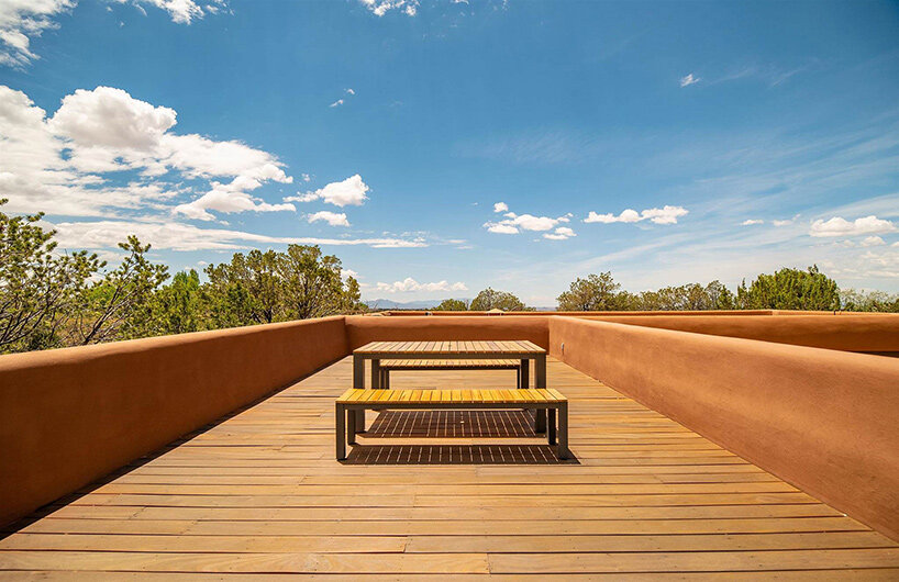 the project sits like a ring placed over the terrain, with its funnel-like roof forming a shaded perimeter walkway and an introverted core.