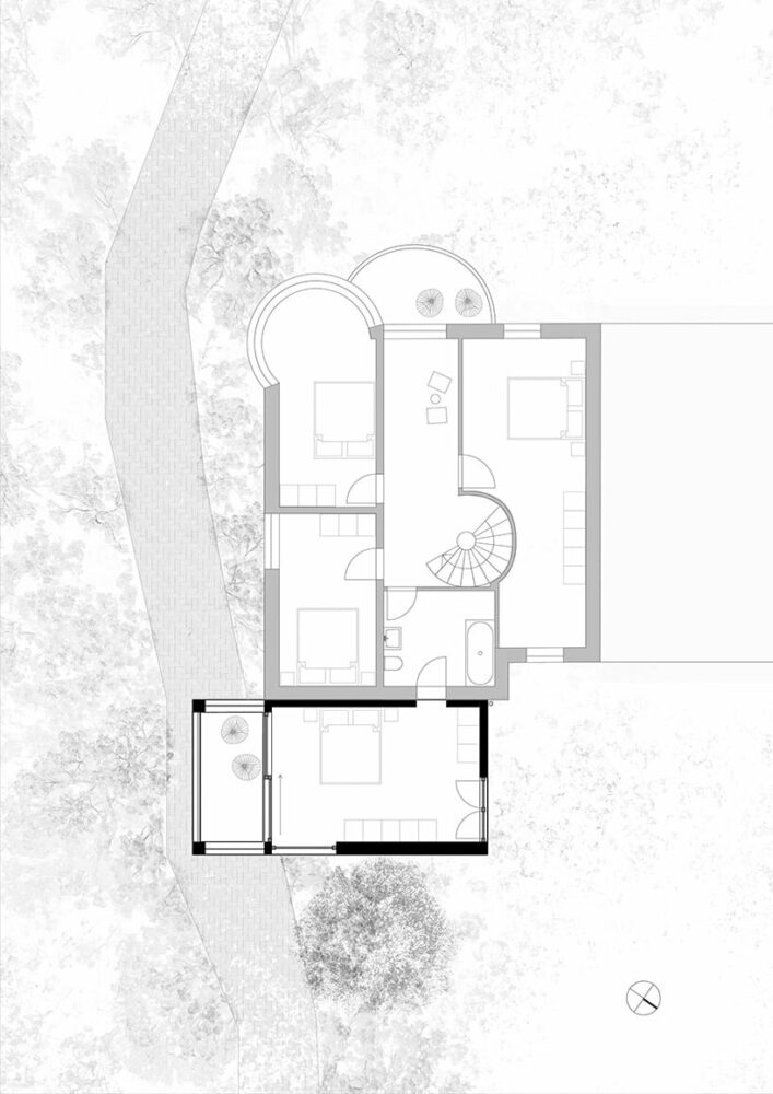 In the heart of Leipzig, Germany, sits the two-story Sonnenwinkel House with a striking cantilevering form. The project by Carolus Zschieschang extends an existing residential structure with a design that harmonizes its urban location with modern housing concepts and sustainable construction methods. The new annex hides behind the original structure and surprises visitors as they approach it from the side with a projecting upper floor. Its opaque outer walls are clad with pre-greyed, vertically arranged larch boards of varying widths and depths, inducing a dynamic facade that changes with the time of the day and weather conditions, and lending the volume a levitating affect. Inside, the interior exudes a bright and airy ambience marked by light and natural tones and textures.