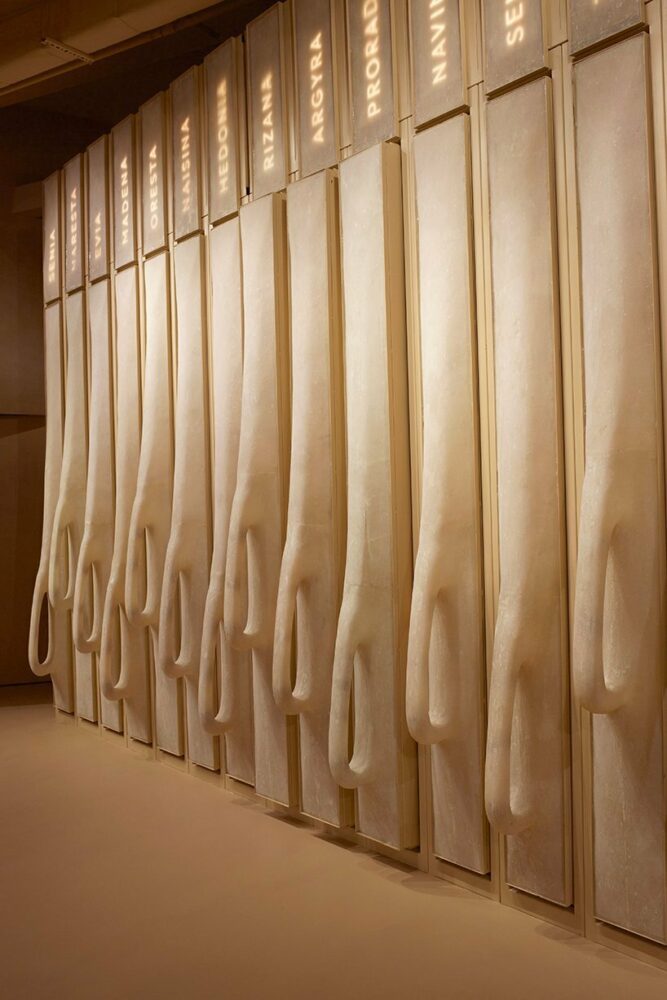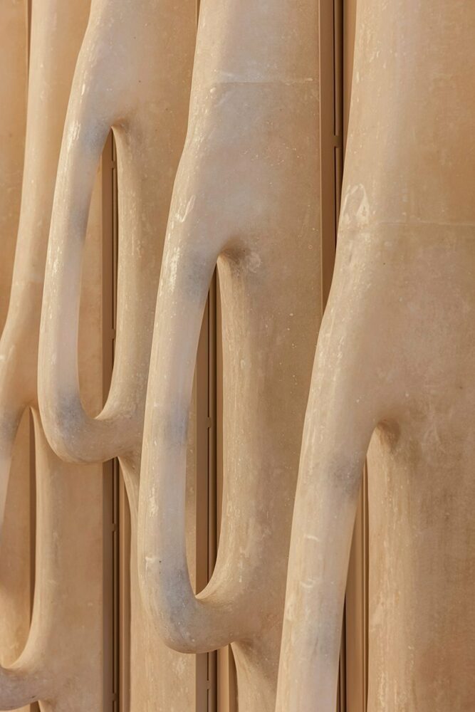 sculptural details throughout the store emphasize the connection between tradition and modernity