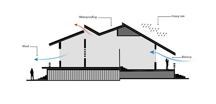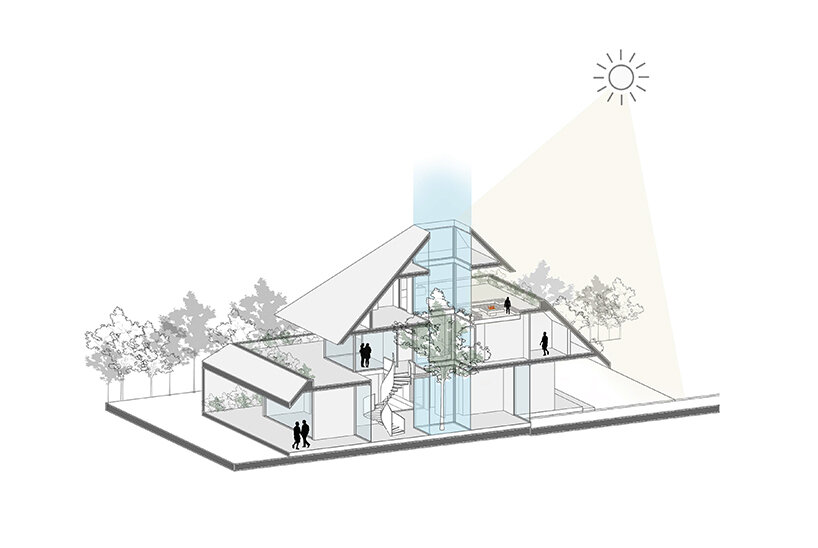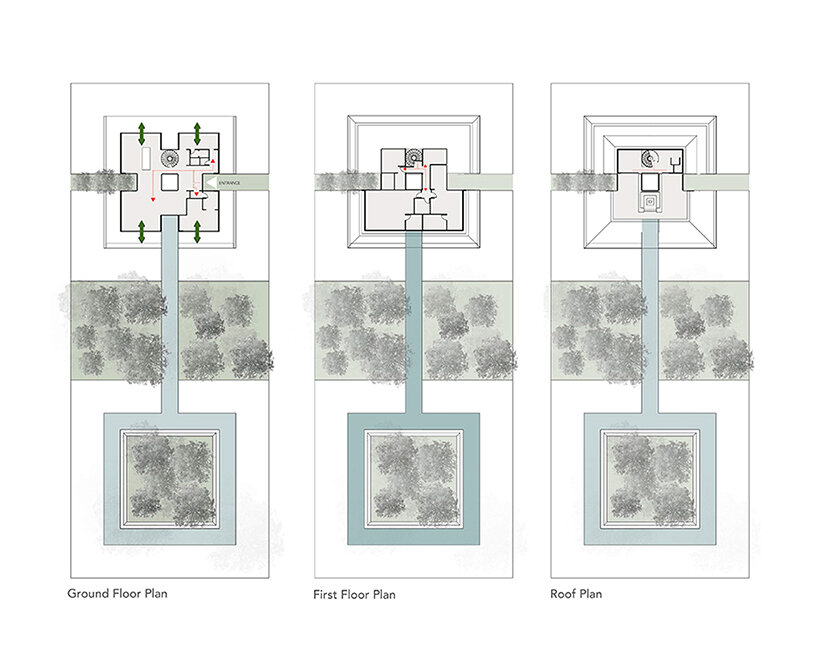 the project sits like a ring placed over the terrain, with its funnel-like roof forming a shaded perimeter walkway and an introverted core.