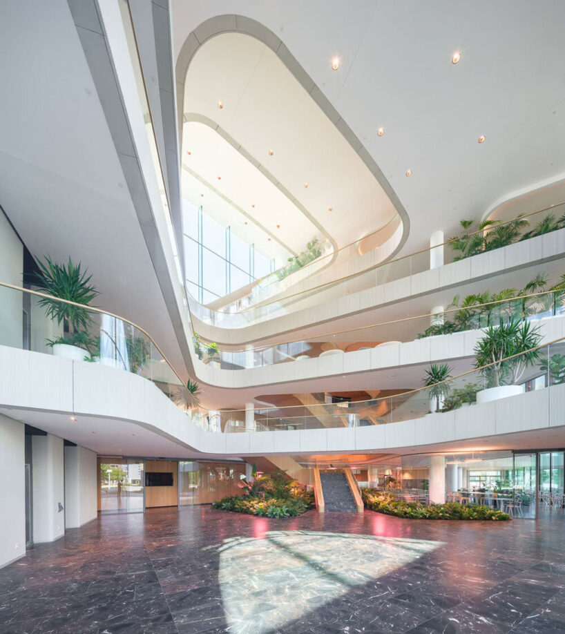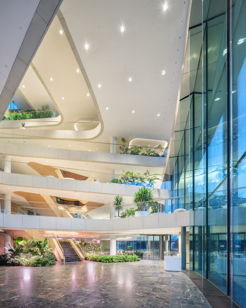 ZDA approached the project with a commitment to sustainable architecture, achieving compliance with LEED Gold standards. 183 geothermal probes provide eco-efficient heating and cooling through ground-source energy, dramatically reducing the building’s energy demand. The surrounding landscape and building envelope include: 2,500 sqm of green rooftops, 2,600 indoor plants, 52 newly planted trees, and over 20,000 shrubs and perennials, 400 sqm of reflective water surfaces, and 600 custom-designed sun-shading elements on the glass facade. These features improve local microclimate, support biodiversity, and harvest rainwater, creating a holistic environmental strategy that integrates building, landscape, and city fabric.