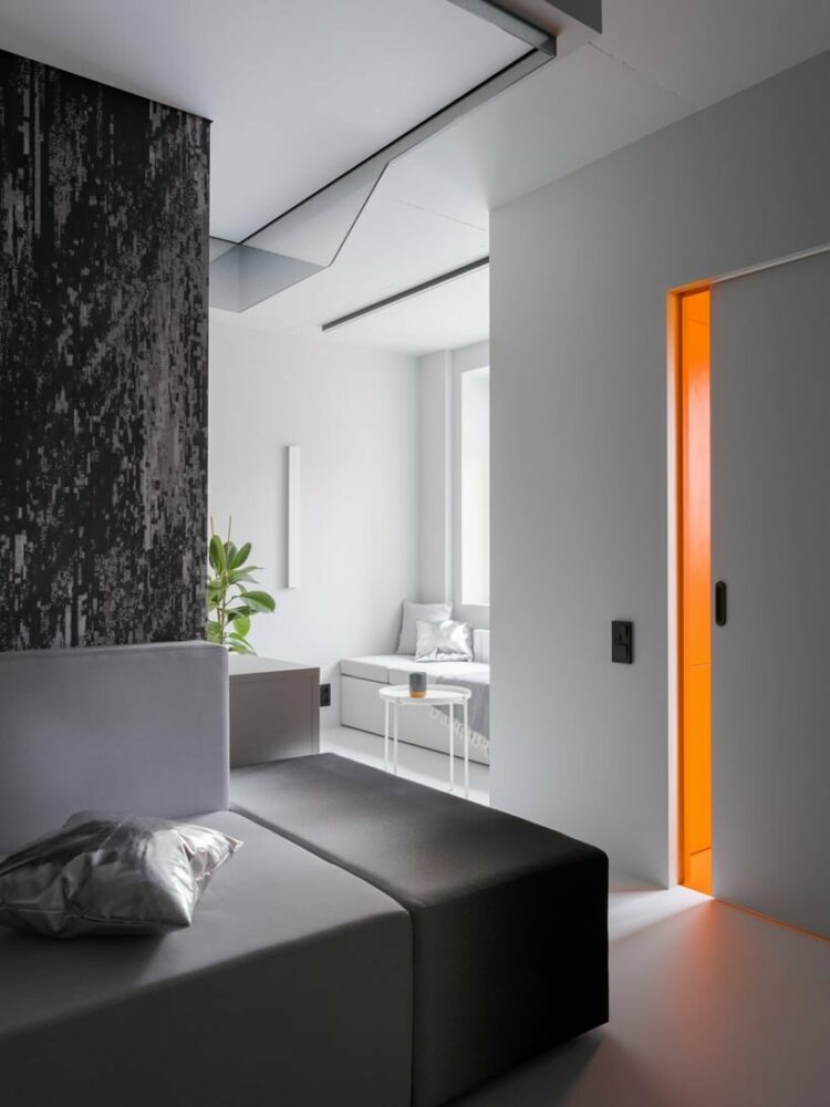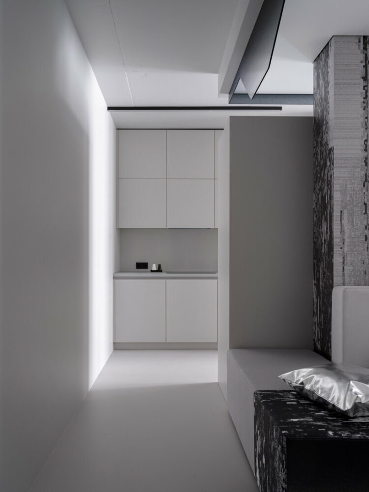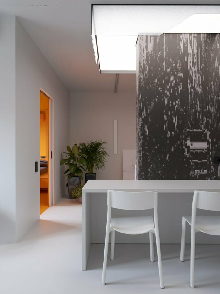 Throughout the space, the design team creates a fluid fusion of epoxy self-leveling floors, painted walls, and painted concrete ceilings which made it possible to unite all spaces and create a monochrome backdrop for bright accents. The space is topped by a translucent stretch ceiling bordered by a ‘visor’ made of plexiglass with UV printing, creating a luminous plane. In the living room, wallpaper with a glitch pattern was wrapped around the central column, mirroring the print on the sofa and the headboards. Its design is based on the layout plans of the apartment which were passed through the glitch generator several times.