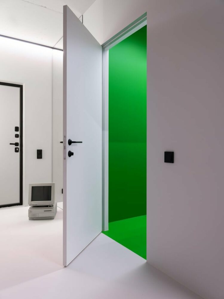 glitch art and vibrant accents enliven and distort UR bureau’s grayscale apartment